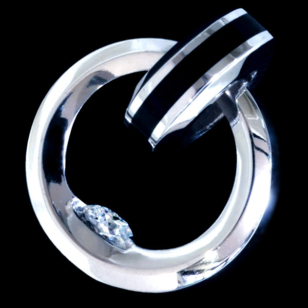 2つのリングが重なったユニークなデザイン。大きなリングの内側にダイヤモンドがセットされています。モノトーンで纏められスタイリッシュな印象です。新品仕上げ済み。ノーブルジェムグレーディングラボラトリーの鑑別書付。