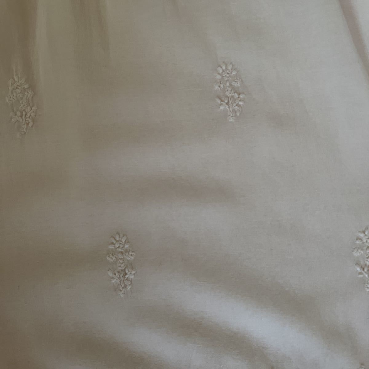 半袖で、胸と背中にピンタックがあり、白い糸で刺繍が全体に散らばって裾にも白い糸でホワイトワーク白の刺繍が豪華に施されています。