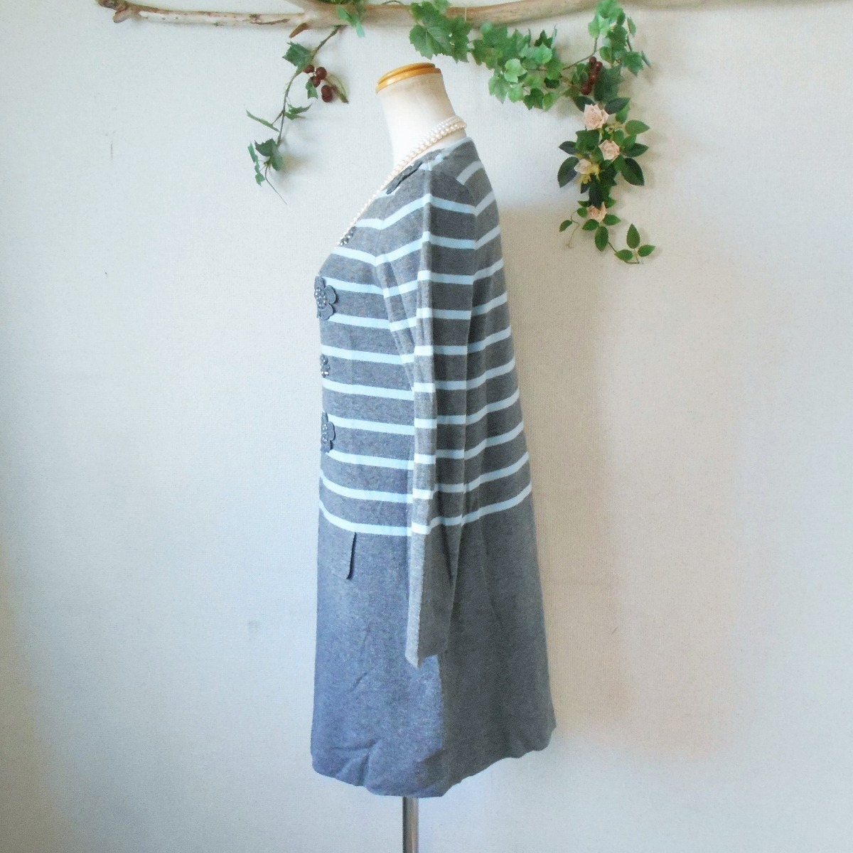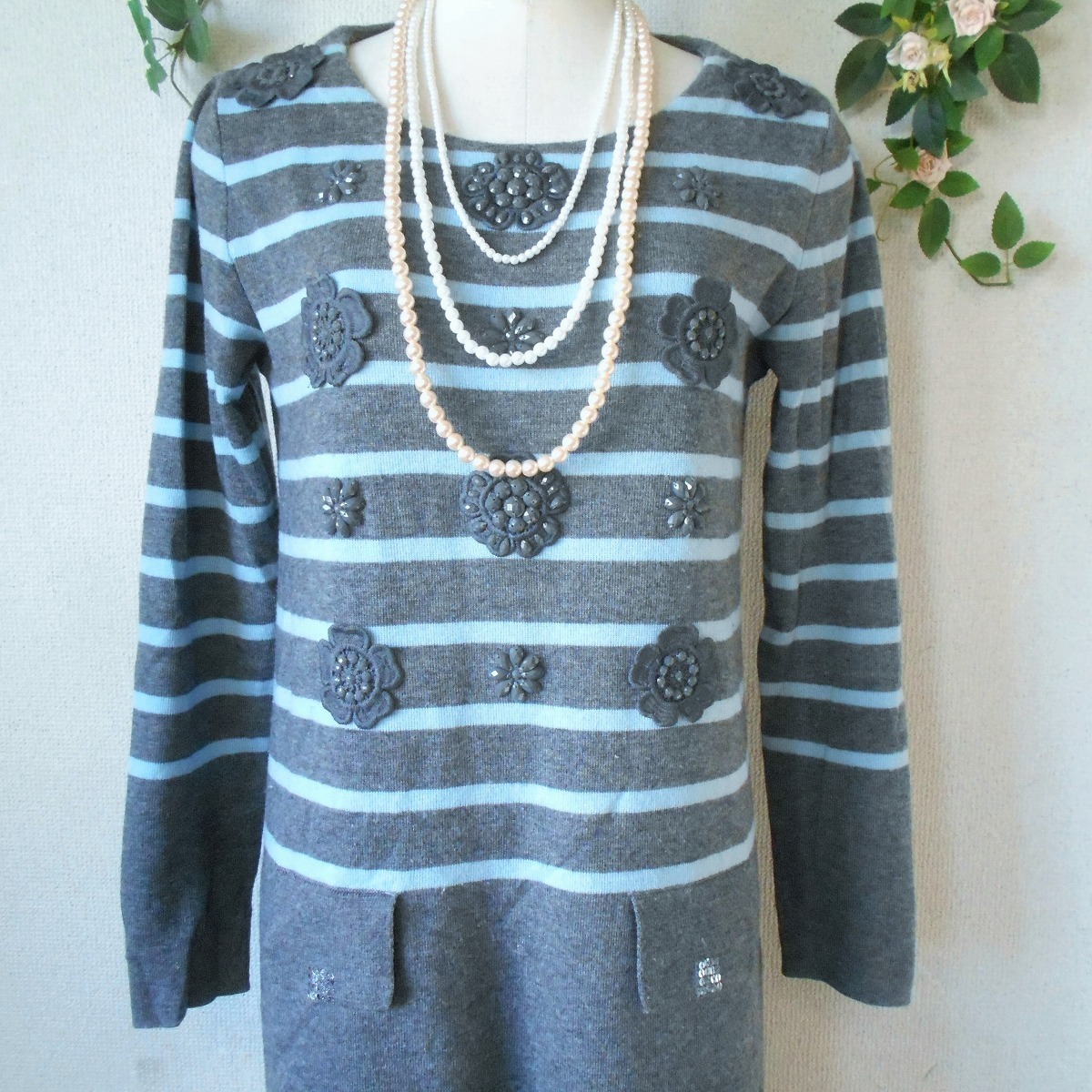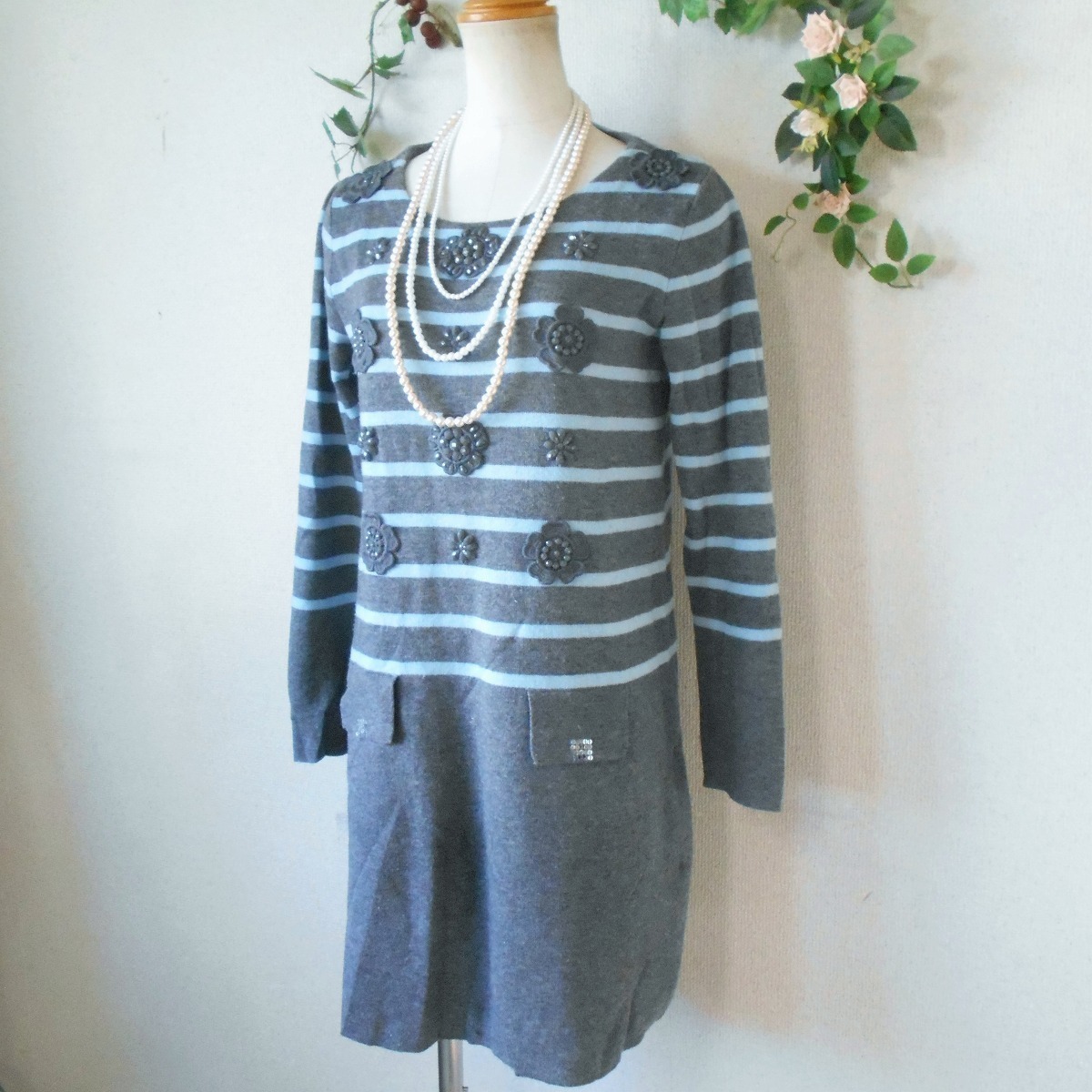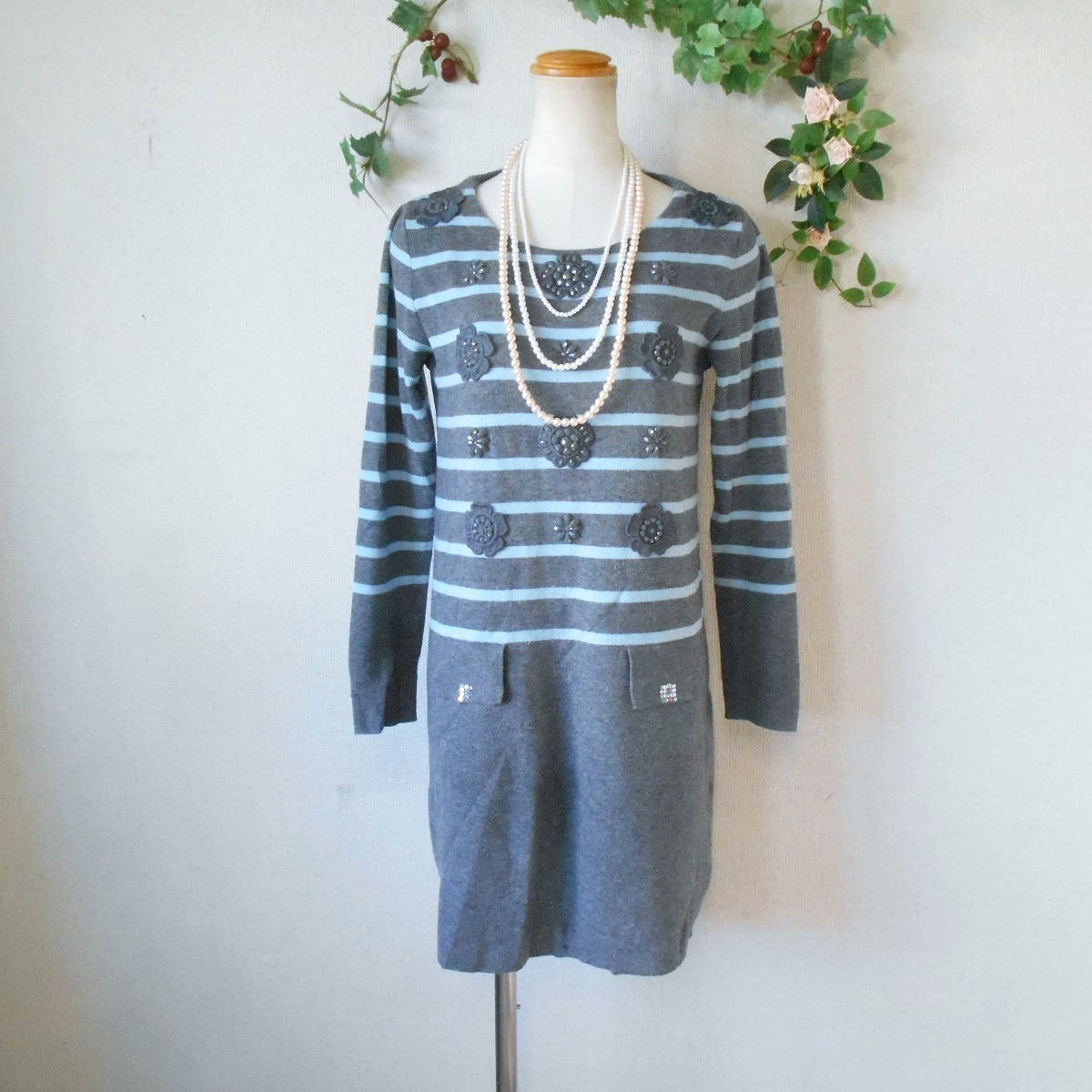 【ポイント】スーパービューティーのワンピースになります。お色はグレーベースで水色のボーダーが入っています。秋冬を中心に着ていただけるお品で、前にはお花のモチーフが付いた、とっても可愛い一着です。