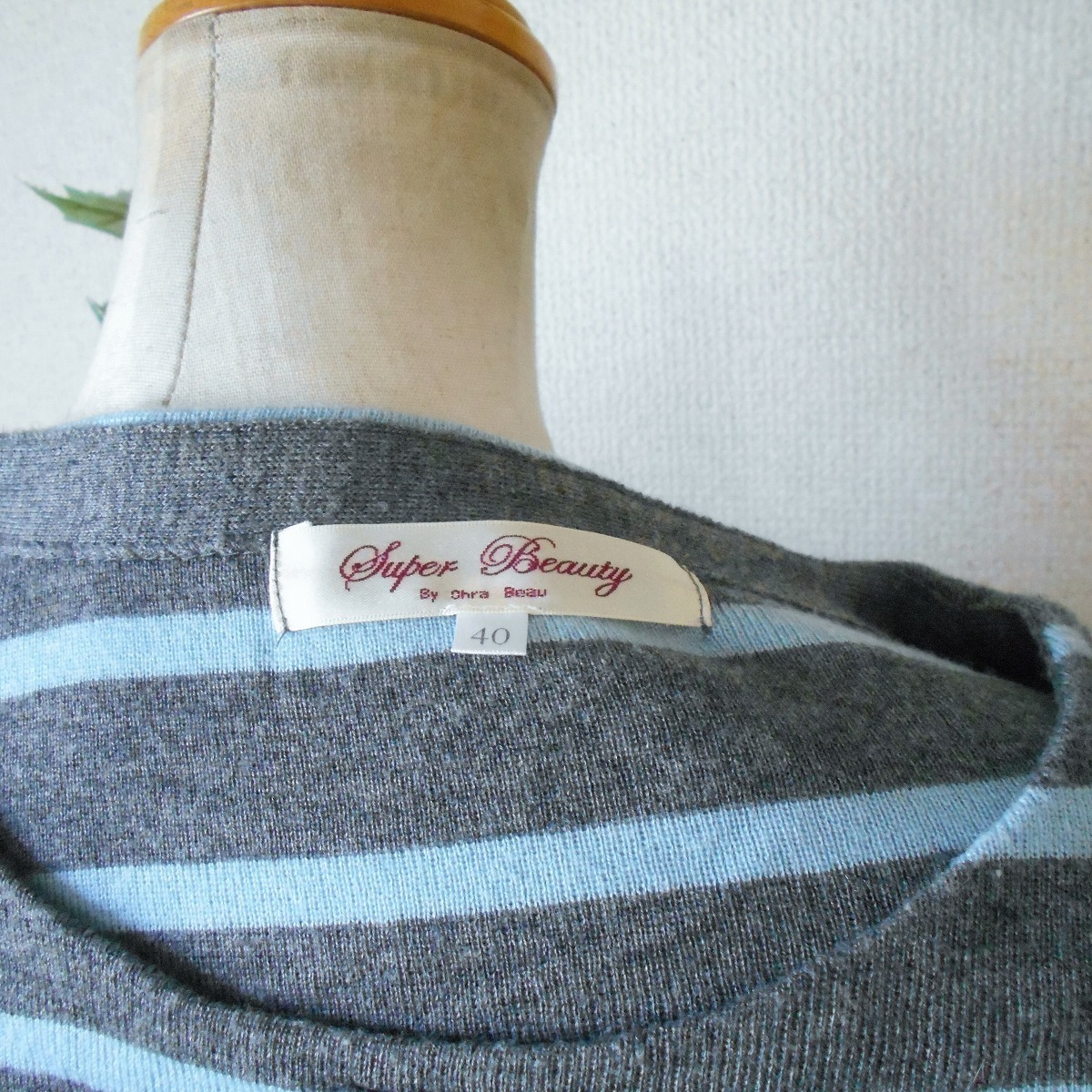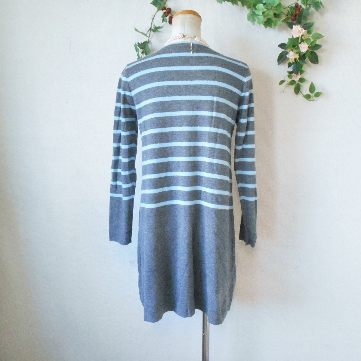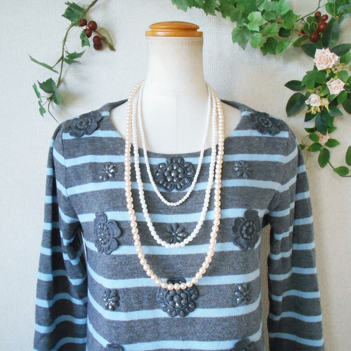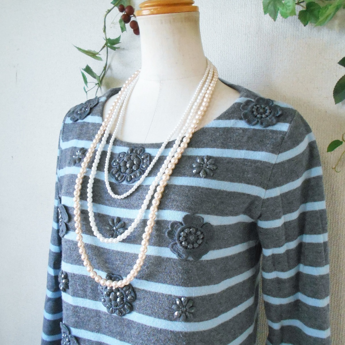 【ポイント】スーパービューティーのワンピースになります。お色はグレーベースで水色のボーダーが入っています。秋冬を中心に着ていただけるお品で、前にはお花のモチーフが付いた、とっても可愛い一着です。