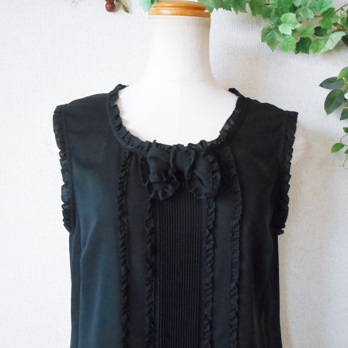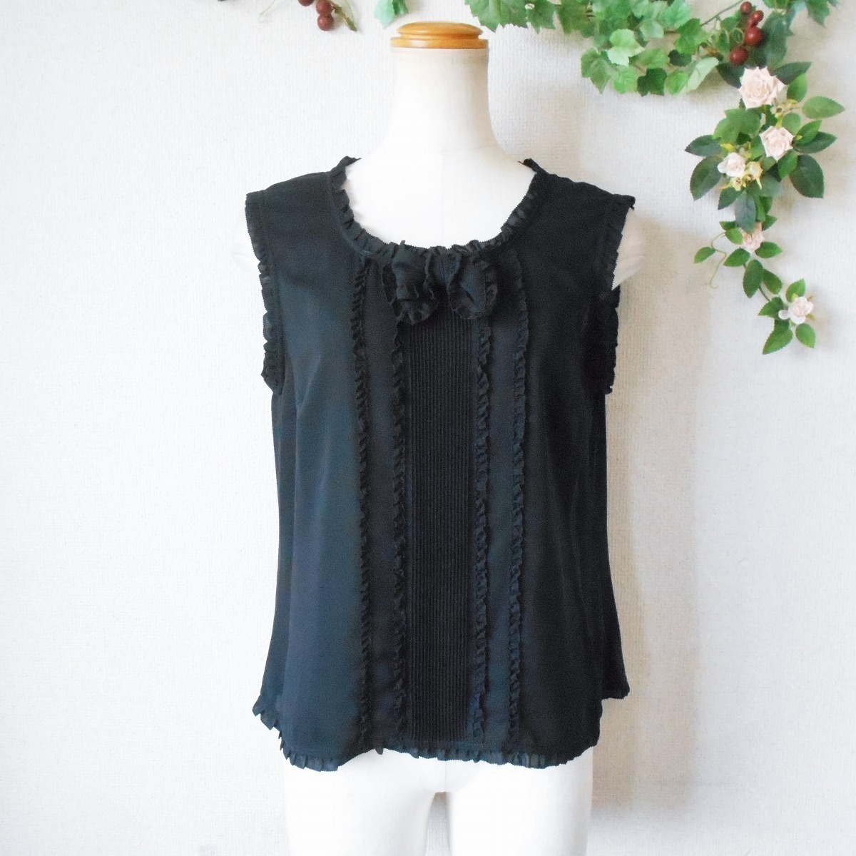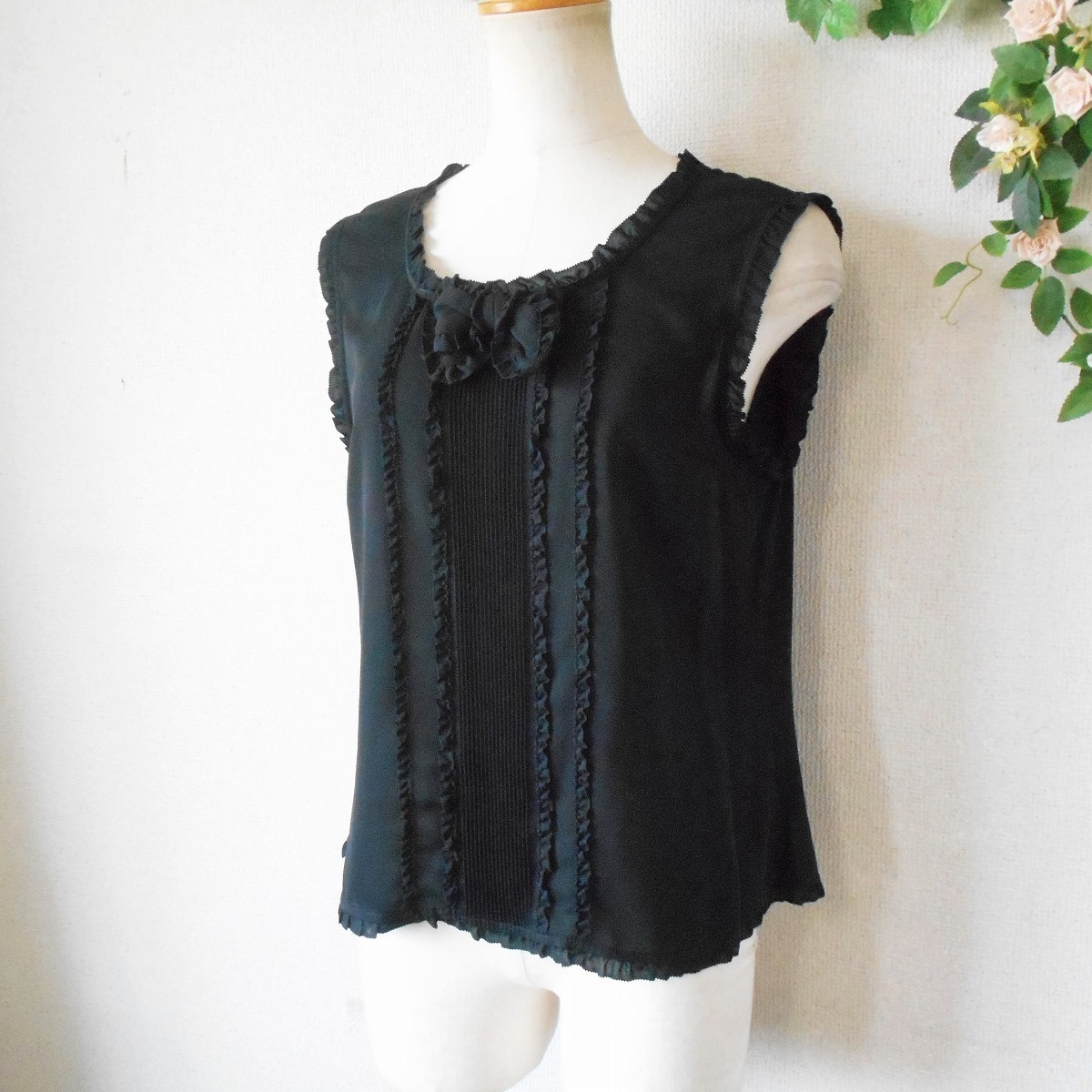 未使用 インゲボルグ INGEBORG ピンタック あり フリル 縁取り 夏 向き ノースリーブ ブラウス 黒 日本製 S