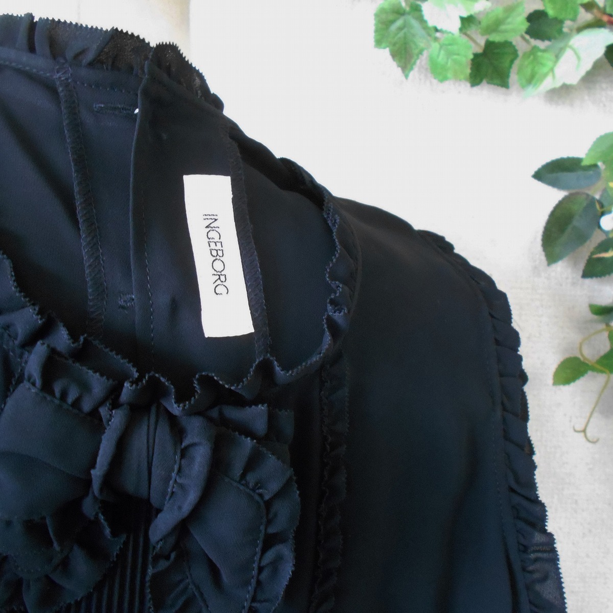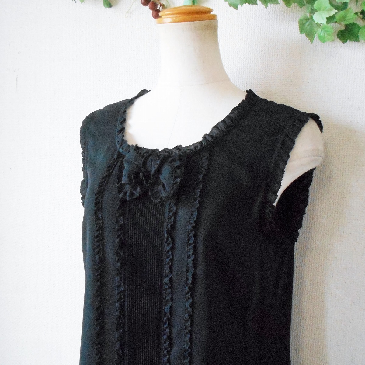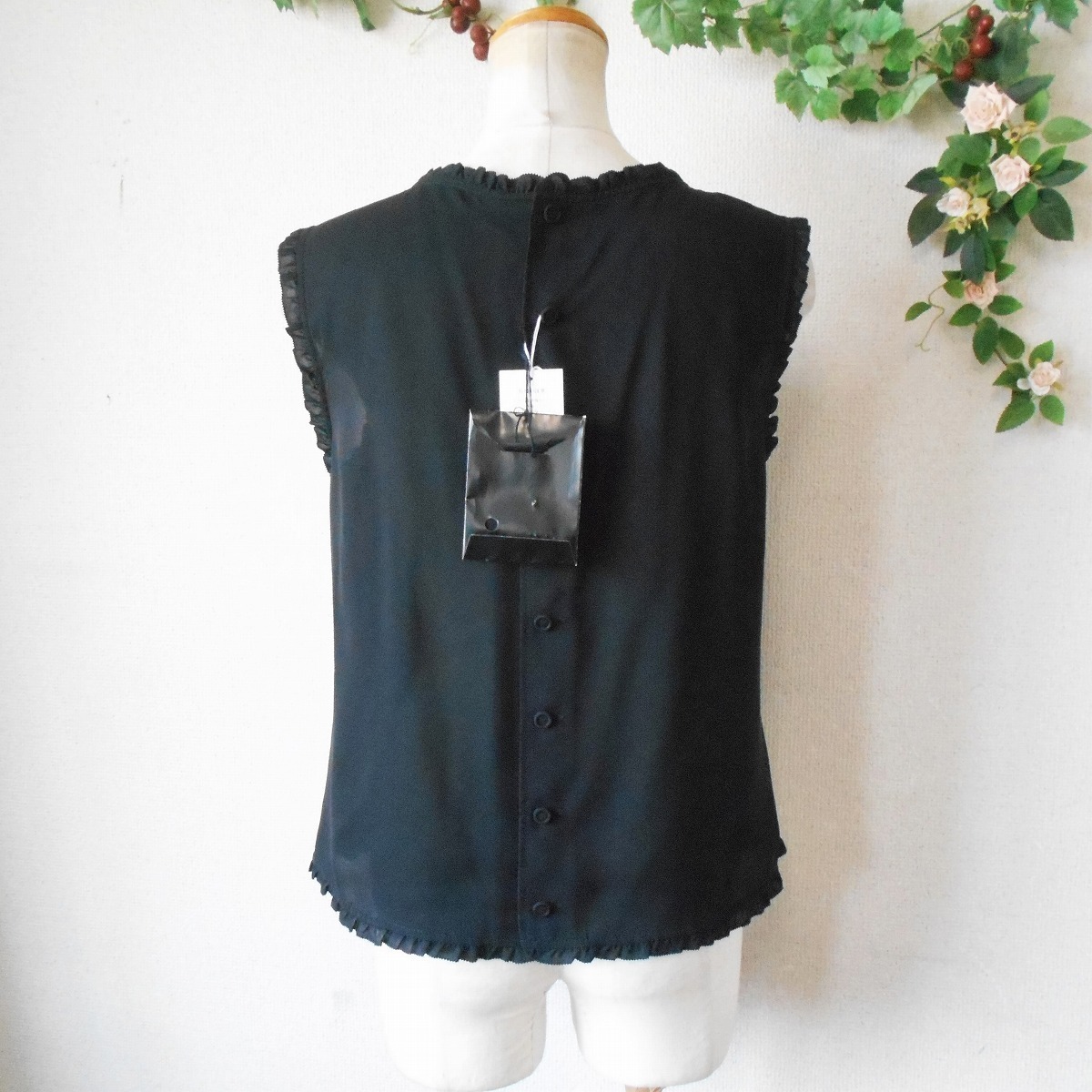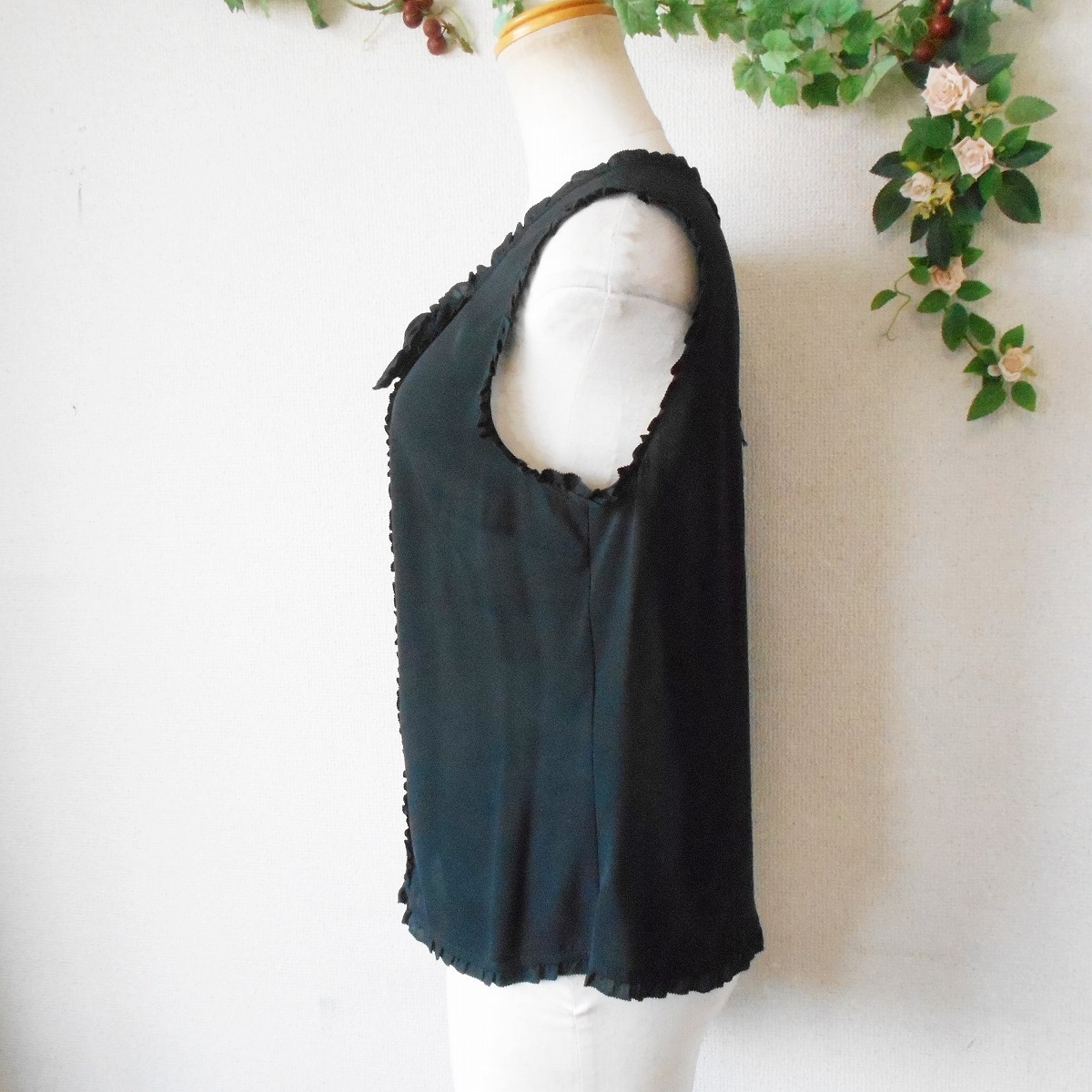 未使用 インゲボルグ INGEBORG ピンタック あり フリル 縁取り 夏 向き ノースリーブ ブラウス 黒 日本製 S