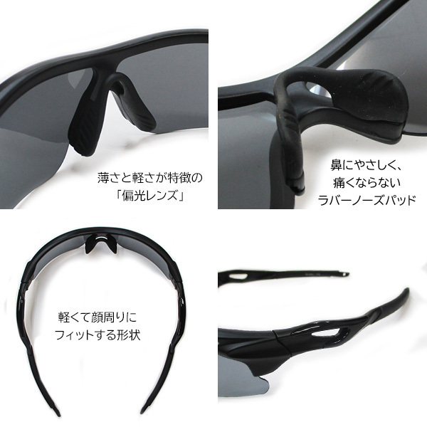 | フィット感がありランニングやサイクリングなど、さまざまなスポーツに対応。 鼻にやさしく痛くならないラバーノーズパッドは、かける人の鼻の大きさにに合わせて調整できます。 また、軽量フレームなので長時間かけていても疲れにくく、快適なかけ心地です。 ミラータイプのレンズは、全ての光を均一に反射させ、色調の変化を極力避けながら、逆光などの眩しい光を和らげます。 【偏光レンズとは】 さまざまな方向からくる反射光を、より効果的にカットできるレンズです。 偏光レンズは光量を抑え、反射光だけをカットし、より快適な視界を確保する機能が大きな特徴です。 ■定価 13800円 ■カラー レンズ:スモークPOLAシルバーミラー、フレーム:マットブラック、チップ:シャイニーブラック ■サイズ(約) レンズ横13.5cm×縦4.3cm、フレーム幅13.7cm(内側) (誤差はあらかじめご了承下さい) ■可視光線透過率11% ■紫外線透過率1.0%以下 ■素材 フレーム:プラスチック、レンズ:プラスチック(TAC偏光レンズ) ■付属品 専用ケース ■新品未使用 ※ご覧のモニターやプラウザの設定、照明等により、画像と実物の色合いが、若干異なる場合が御座います。 ※製造上の過程により商品によっては細かな傷がある場合が御座います予めご了承下さいませ。 | |