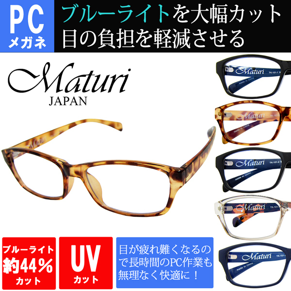 PC用メガネでブルーライトを44.1%カット! ブルーライトの影響により、眼病や体内のリズムを狂わせ様々な障害をもたらす恐れがあると問題視され、テレビや雑誌でも多数取り上げられてきています。 パソコンやテレビ、スマートフォンなどの液晶ディスプレイにはバックライトとしてLEDが使用されていて『ブルーライト』と呼ばれる眼には見えない青い光が発せられています。 『ブルーライト』は光のエネルギーが強いため、長時間見続けるとまふしさを感じたり、視界がチラつき、眼精疲労、ドライアイ、肩こり、視力低下の原因になります。 そんなブルーライトからあなたの目を守るために「Maturi PC」は誕生しました。 眩しさやちらつきを低減させ、眼を疲れにくくするので、ブルーライトを発する長時間のパソコン作業やスマートフォン、液晶テレビ、ゲーム機などの操作も無理なく行うことができます。 ■カラー:フレーム/ブラウンマーブル(べっ甲)、レンズ/クリア ■サイズ:(約)レンズ横5.4cm×縦3.5cm、フレーム幅(外側)14cm (実寸につき誤差はあらかじめご了承ください) ■素材:レンズ/マルチコート加工、紫外線UVカット約99%、フレーム/プラスチック ■ブルーライト約44.1%カット ■可視光線透過率:90% ■紫外線透過率:1.0%以下 ■付属品:Maturiメガネケース ■新品・未使用 ■定価:6500円 【注意事項】 ※本製品はパソコンや携帯電話等のディスプレイ用メガネです。パソコンや携帯電話等のディスプレイを見る時以外は本製品を外して下さい。 ※失明や視力低下の恐れがあるため本製品を着用した状態で太陽等は見ないで下さい。 ※ご覧のモニターやプラウザの設定、照明等により、画像と実物の色合いが、若干異なる場合が御座います。 ※製造上の過程により商品によっては細かな傷がある場合が御座います予めご了承下さいませ。 | |