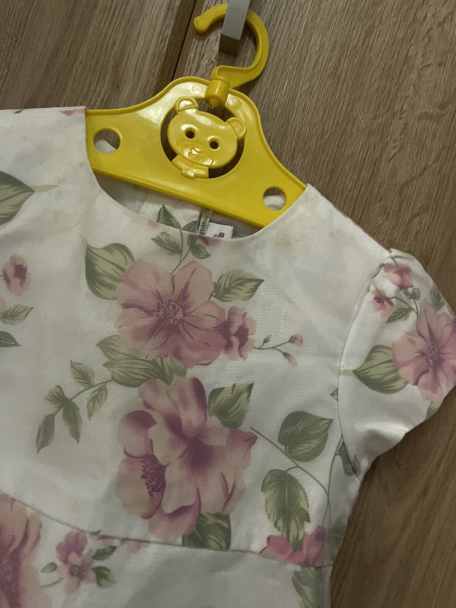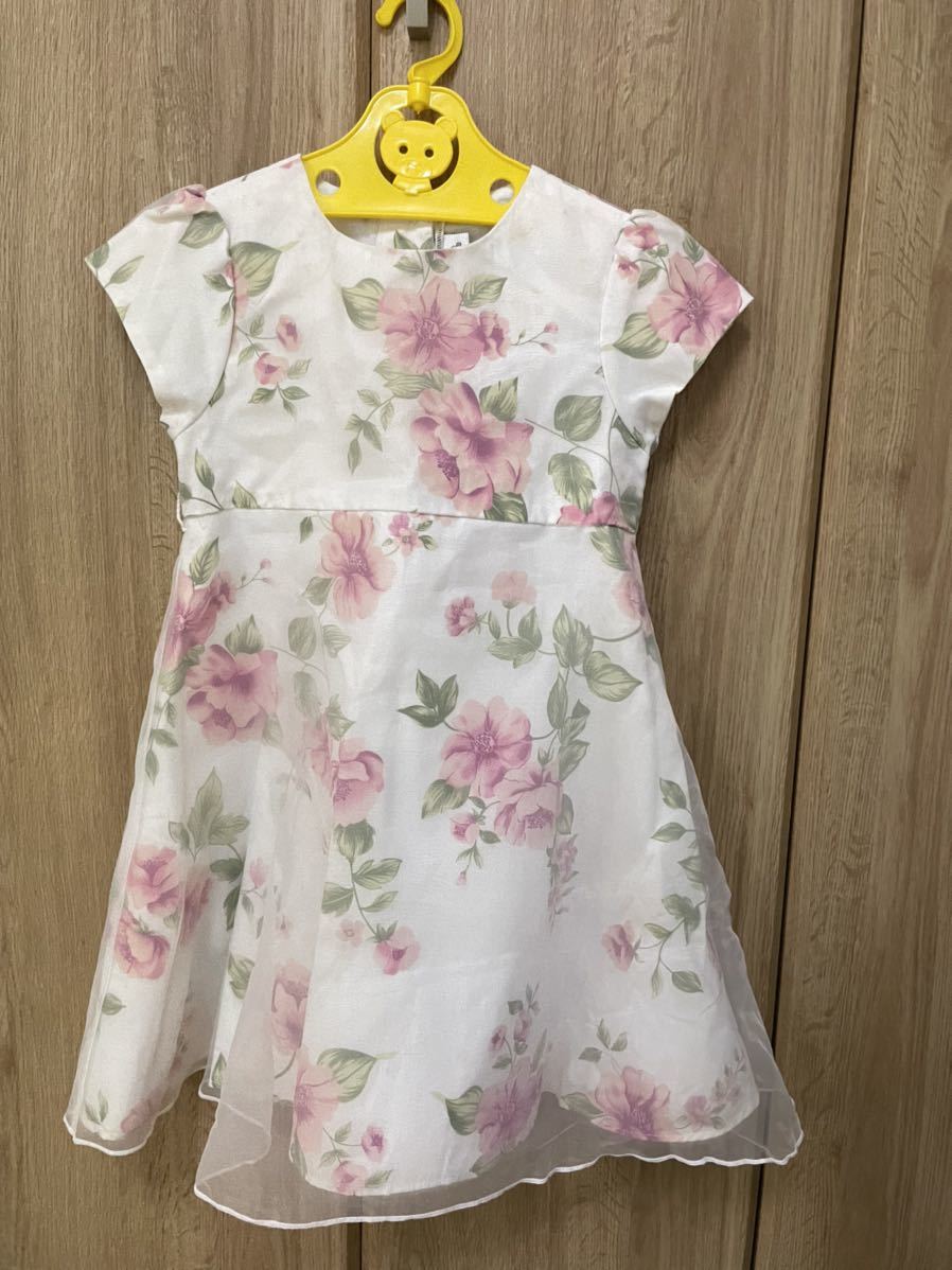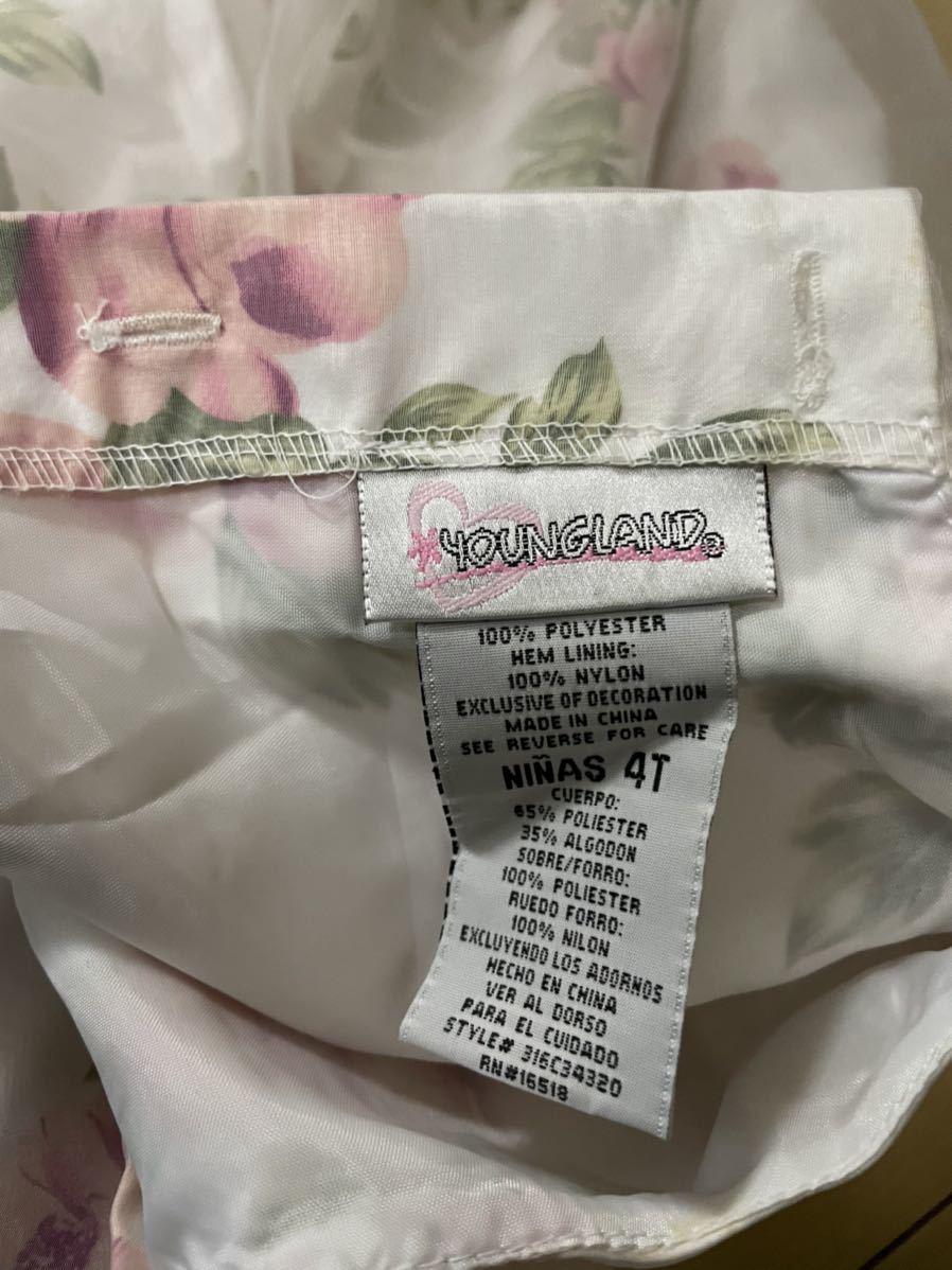 こちらサイズ4tとありますが大きめ110から120程度に感じます。素材は綿ポリ混合。中古のため汚れありますのでカーディガンやジャケットを羽織ってご利用いただければ幸いです。