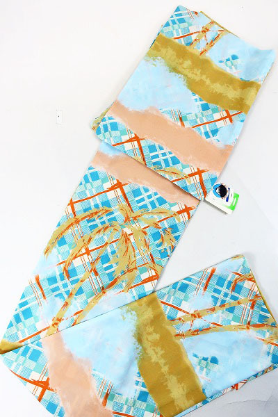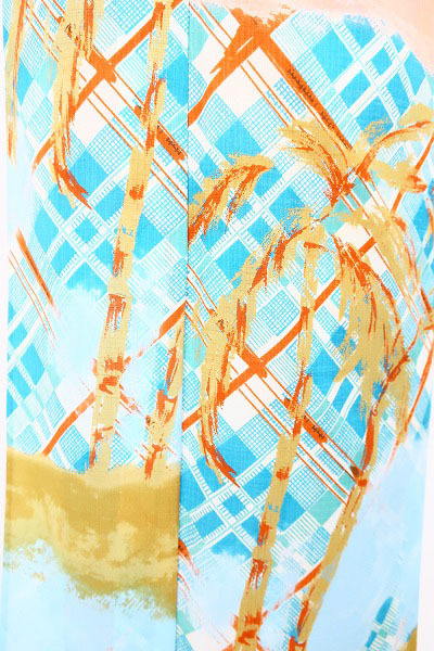 tsumori chisato(ツモリチサト)ブランド浴衣です。水色のポリエステル地にチェックの格子柄を表し、油彩画のタッチで南の島が描かれています。ツモリチサトブランドは「ガーリィ&セクシー」がコンセプトのフェミニンな雰囲気が特徴ですが、そのツモリチサトらしい大人の可愛らしい雰囲気の浴衣です。セオアルファは、汗をサッと吸い取り、すばやく発散。爽やかな肌触りに適度なハリとコシで美しいシルエットを保ちます。浴衣のみならず、夏のおきものとしてもいかがでしょうか。 ※帯と小物はセットではありません。着物単品での出品になります。 ※トールサイズですのでご身長の高い方におすすめです。 |