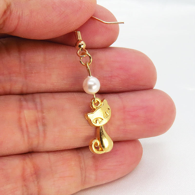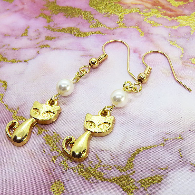 マットゴールドの猫のチャームが上品な印象を与え、クリスタルホワイトのパールが華やかさを演出します