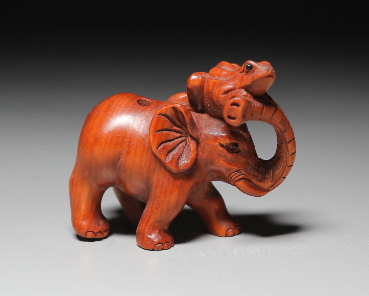 ★吉丸★ 柘植根付C918【象に蛙】 黄楊木彫