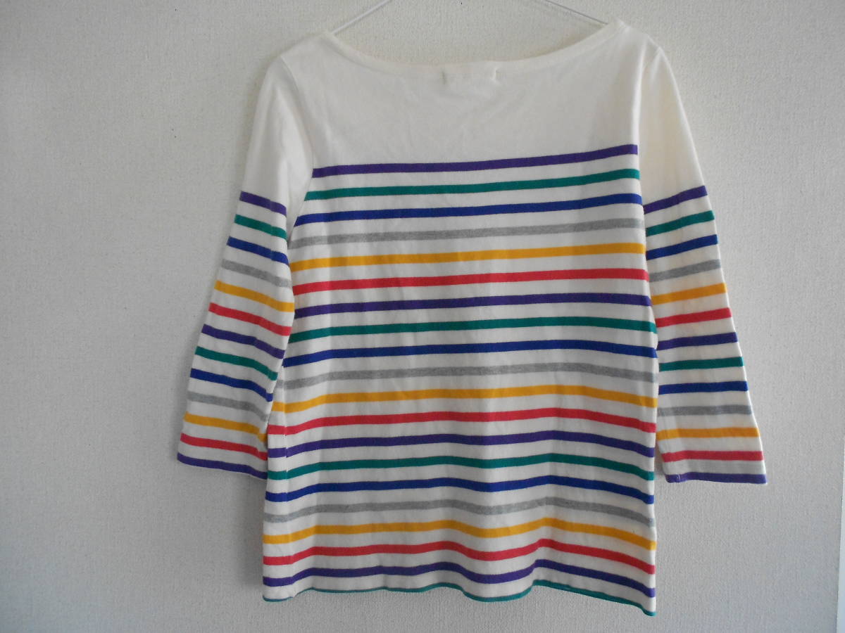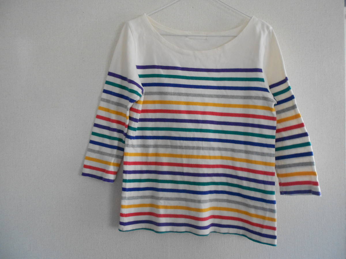 ジーナシス 7色のカラフルなストライプ柄・七分袖トップス・美品です。満100%、着丈58,5、胸幅48,肩幅44,七分袖丈48,5、Fサイズです。USEDですが、割ときれいに着ていると思います。送料はクリックポスト185円です。