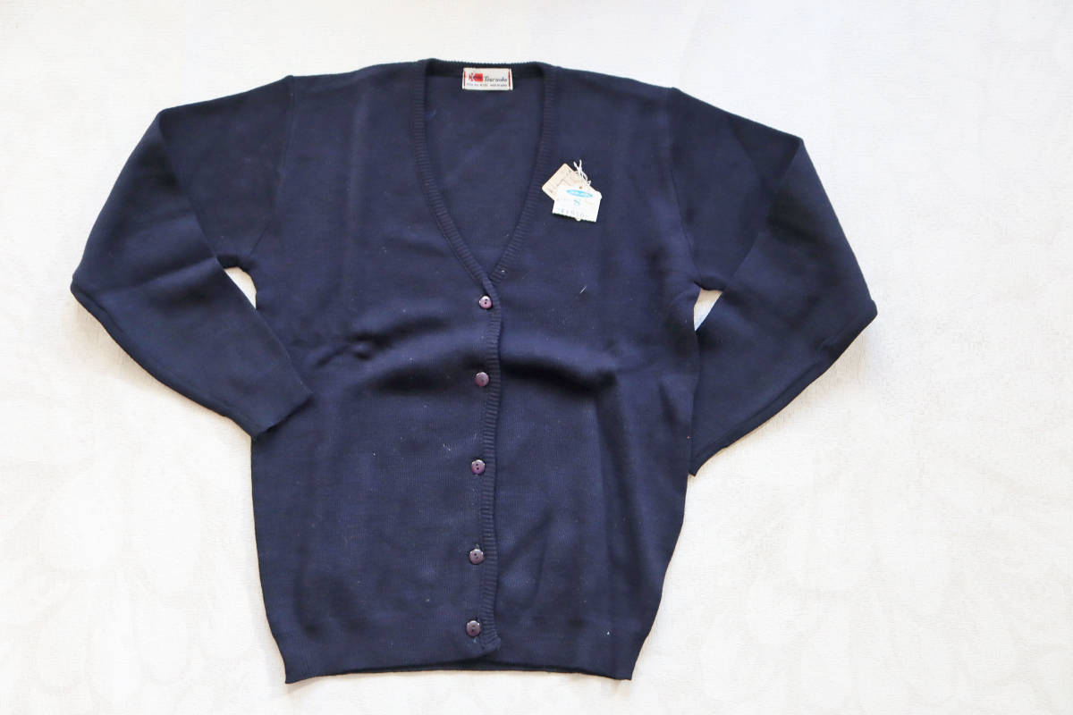 ネイビーのカーディガン。 昭和の時代のお品物。 by鶴岡産業 日本製 V襟。 ハイゲージの糸を使用。 ふっくらとした感触です。 裾と袖口はゴム編み。 「S」の表示です。 150cm位の方に好適かと推測します。 下記の実寸をご参考の上、ご検討、よろしくお願いします。 ◆色 :紺 ◆サイズ: 胸囲82 着丈55 肩幅35 袖丈45 ◆素材:アクリル70 ウール30 ◆メーカー希望小売価格(税抜き):@1950 ◆備考:デッドストックです。 特筆すべきはありません。 落札の際は、その旨、ご了承下さい。 | |||