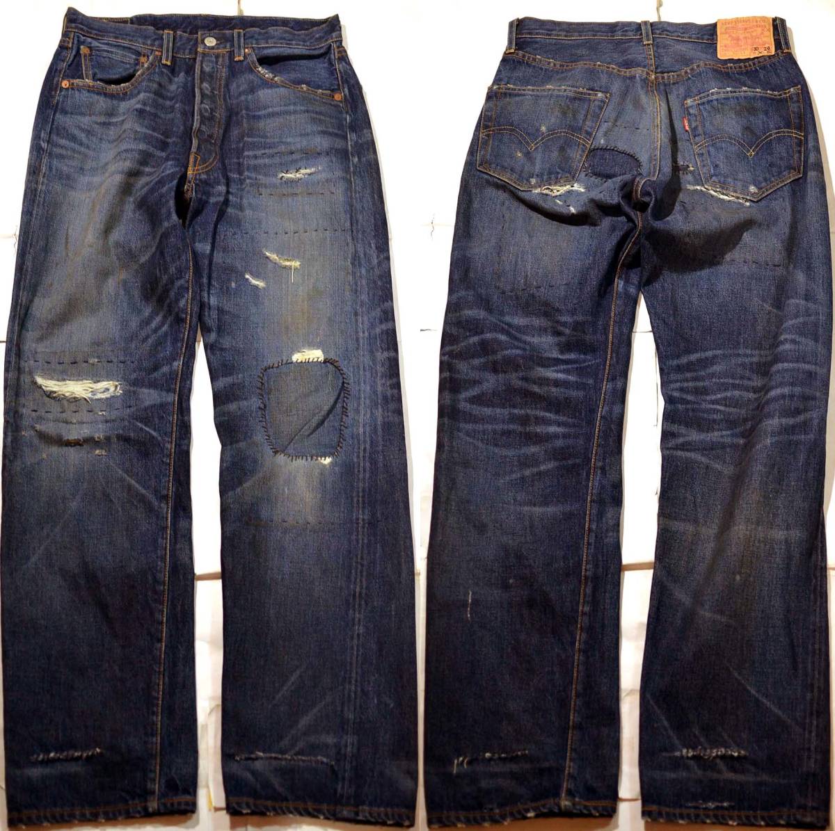 55501XXギャラ入りです。『ディテール紹介』アメリカ製の復刻です。他のディテールは、隠しリベット、ビッグE、ウエストVステッチ、 赤耳、コインポケット耳、ギャラ入りパッチ、バナナイエローステッチ、裾チェーンステッチなど。『状態』アーティストのシグネチャーモデルと思いますが、正確には確認できません。 クラッシュ加工は当て布リペアされており、ポケット、ボタンホールなどはノーダメージでしっかり使えます。『色落ち、特徴など』 色落ちは抜群にかっこよく、非常に深みのあるドス黒いインディゴで、全体に綺麗な縦落ちが見られます。ヒゲやハチノス、また濃淡のメリハリも強烈で、 スペシャルな色落ちです。耳のアタリもビッシリ。加工は全て手作業で行われており、かなり手間がかかっております。トップレベルのかっこよさだと思います。
