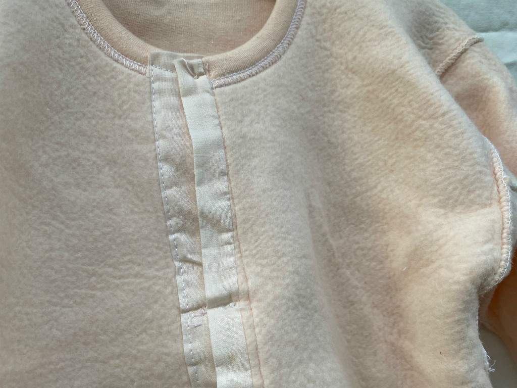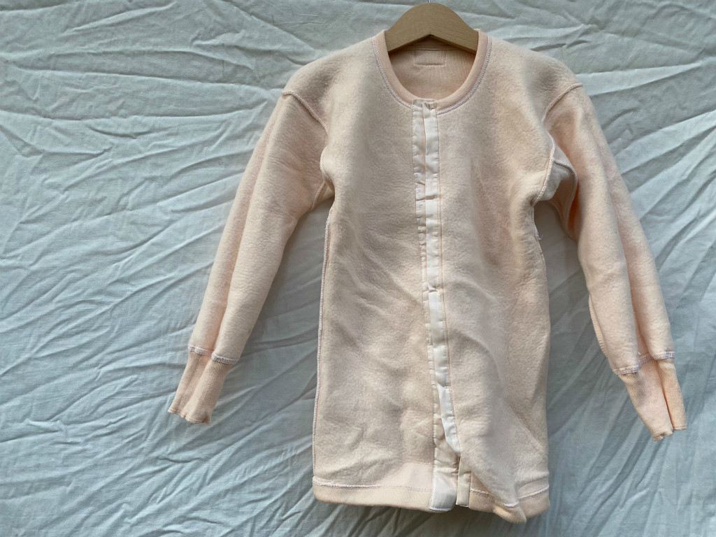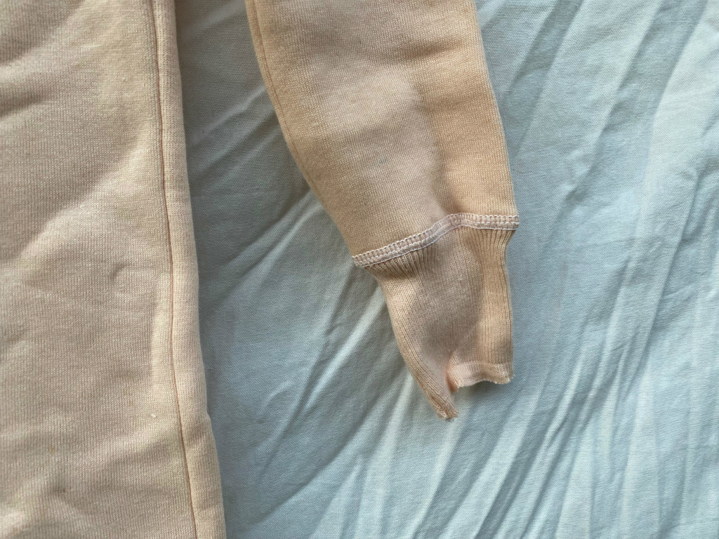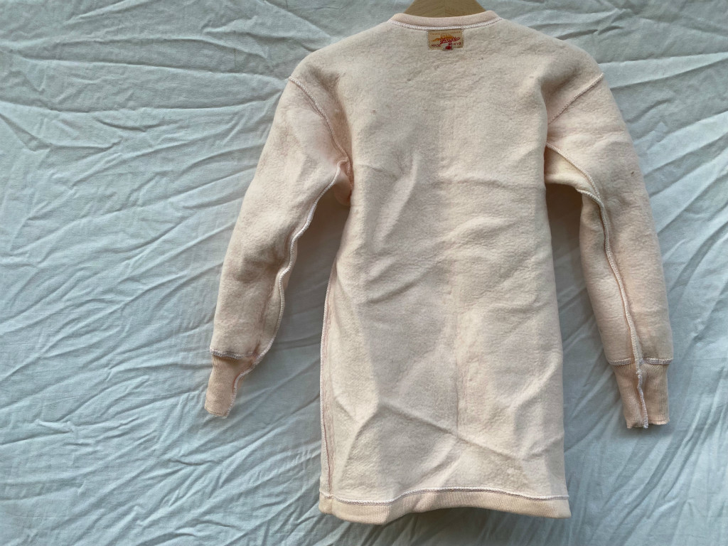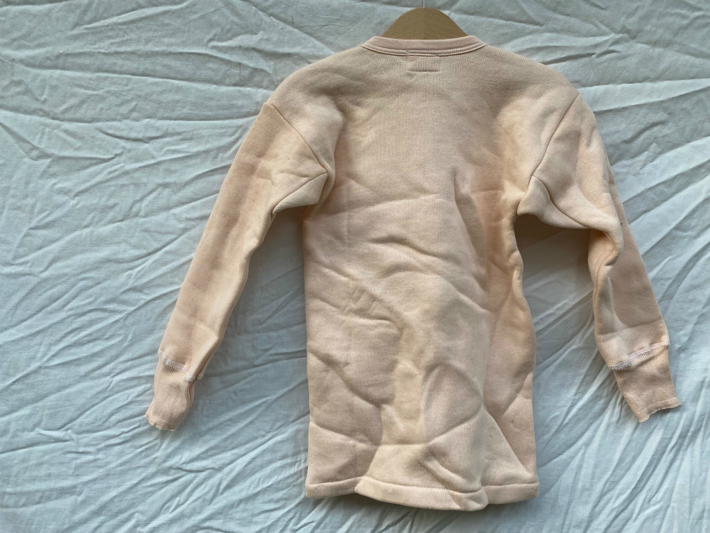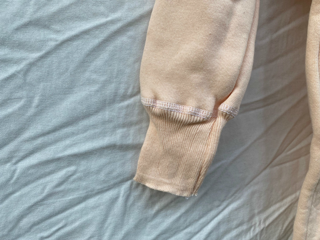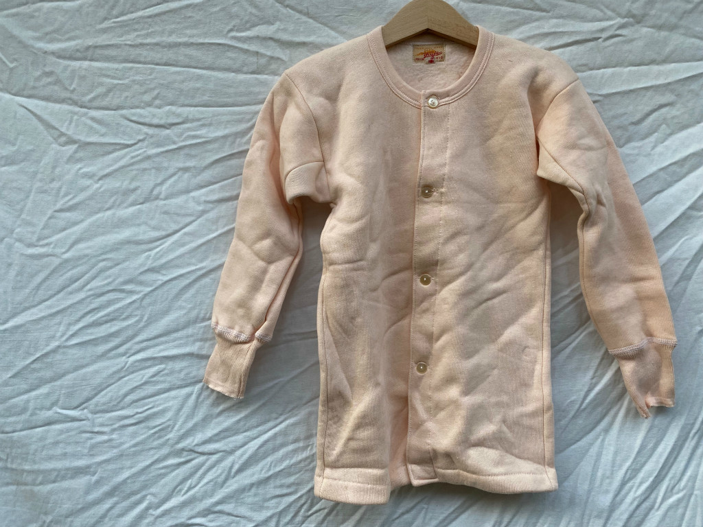 説明:かわいい色味と、今でもありそうなデザイン。ちょっとアメリカを意識したような風に気もいいですね。上質な肉厚のスウェット生地の一枚。子供用なので大人の方での通常使用は厳しいかもしれませんが、生地サンプルとしてもいいかもしれません。