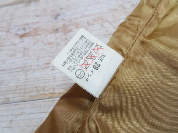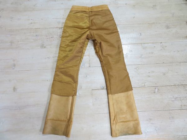 USED品です。クリーニングはしていません。着用感があり、裾、両モモ、ヒップに汚れ、裏生地に破れがあります。また、ジッパーの金具(真鍮)からでた緑青で、その回りに色移りがあります。裾は切りっぱなしです。表地のレザーに破れているヶ所や、縫製の解れはなく、生地もしっかりしていて問題なく着用していただけます。現状での出品のため、神経質な方や、細かな事を気にされる方は入札をお控えください。