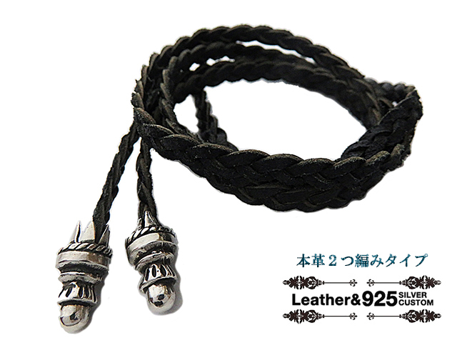 革紐 ブラック レザーネックレス シルバー925 2つ編み ボロチップ チョーカー エンドパーツ 本革