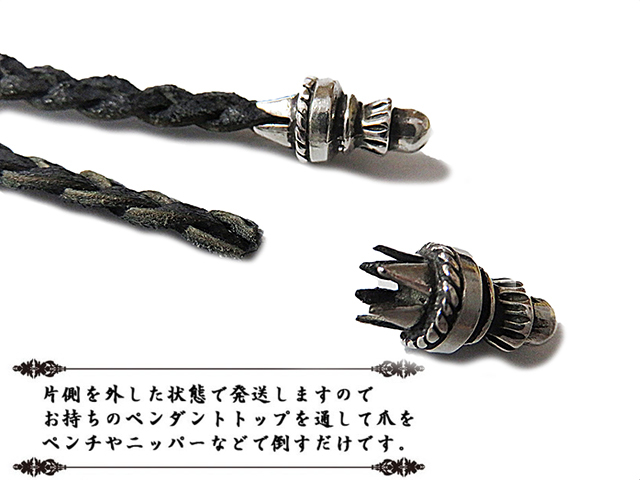 商品発送時にエンドパーツ片方を外した状態で出荷致しますのでお客様のペンダントトップを通してエンドパーツの爪をペンチやニッパーなどで爪を押さえて下さい。接着剤も併用されるとより効果的です。