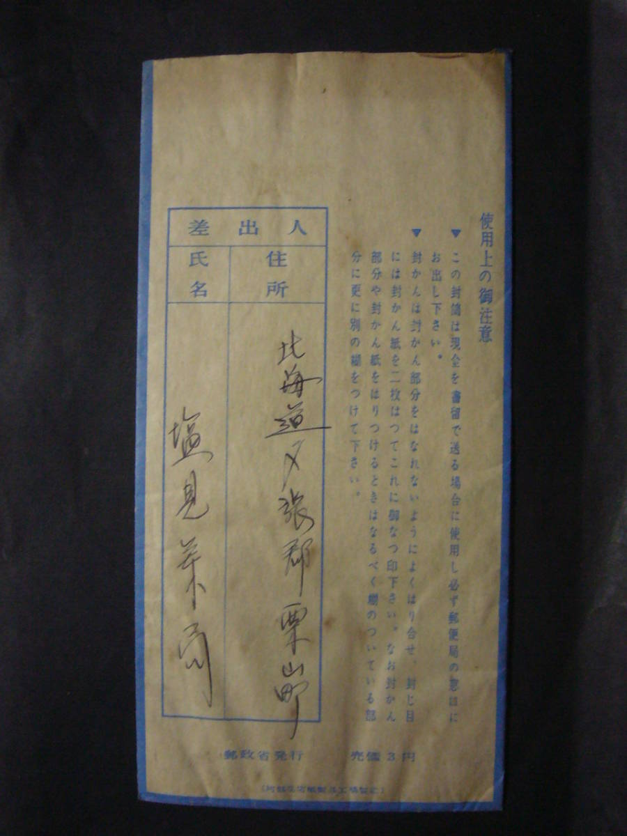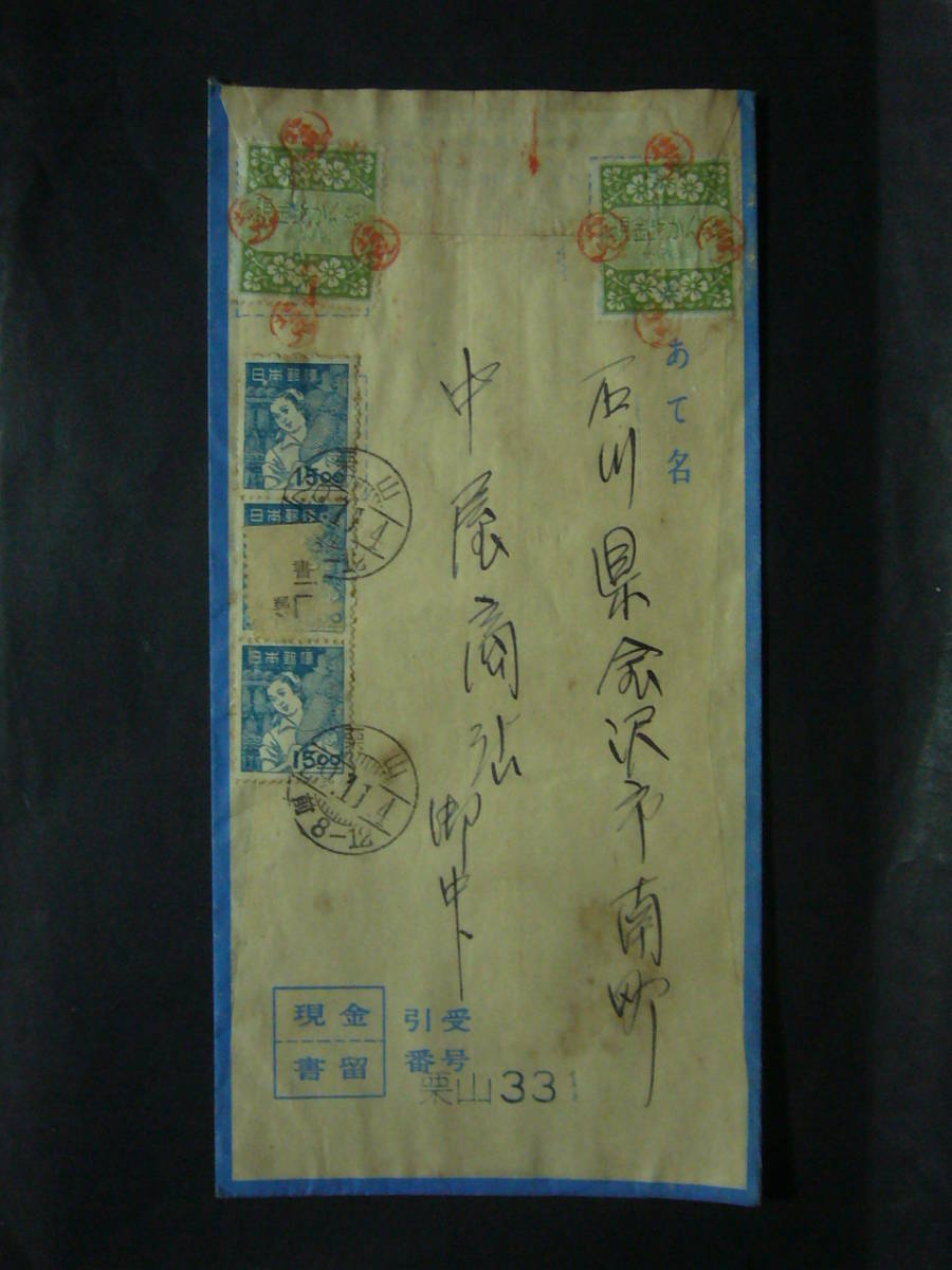 ◆エンタイヤ◆6664 現金書留 産業図案 15円 3枚貼 栗山 29年 北海道