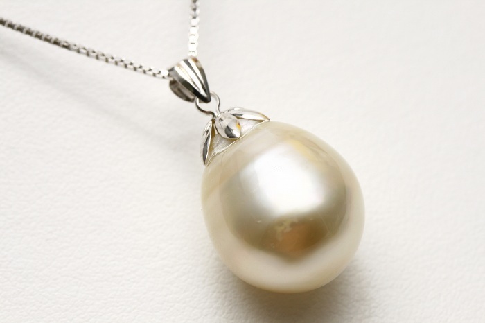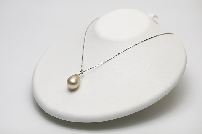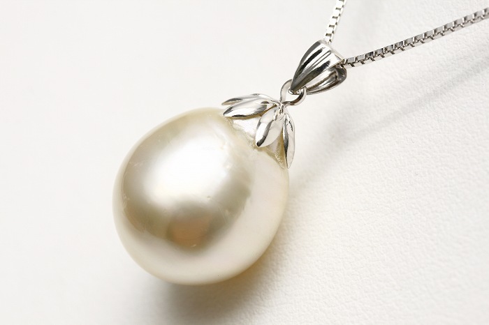 希少な15mmサイズの南洋白蝶真珠ペンダントです。 南洋真珠は約10?12mmサイズの大珠が多くできますが, ここまでのサイズのものは非常に珍しいです。 上品なホワイトカラーのお色目が出ています。 この一粒を胸元に飾るだけで全体の印象ががらりと変わる一品です。 | |