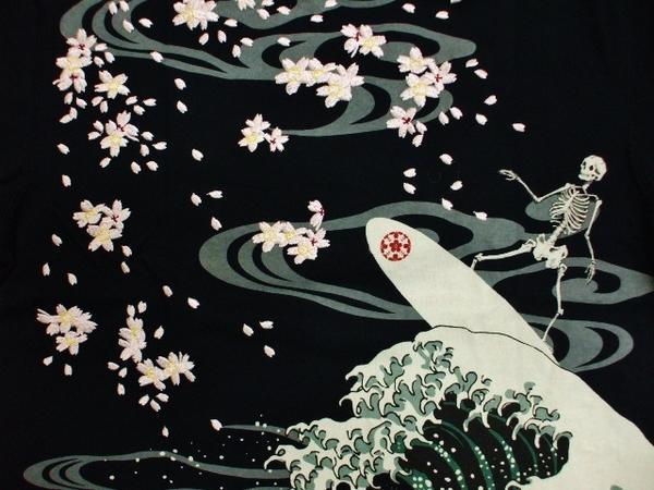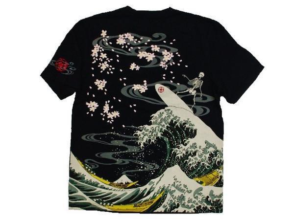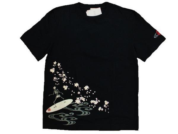 | 【商品名】 | 百花繚乱/ひゃっかりょうらん 23520603 和柄・刺繍&抜染(着抜)プリント・『波乗り髑髏/桜』柄・半袖Tシャツです。 刺繍Tシャツ 和柄半袖Tシャツ 丸首 クルーネック ドクロ スカル |