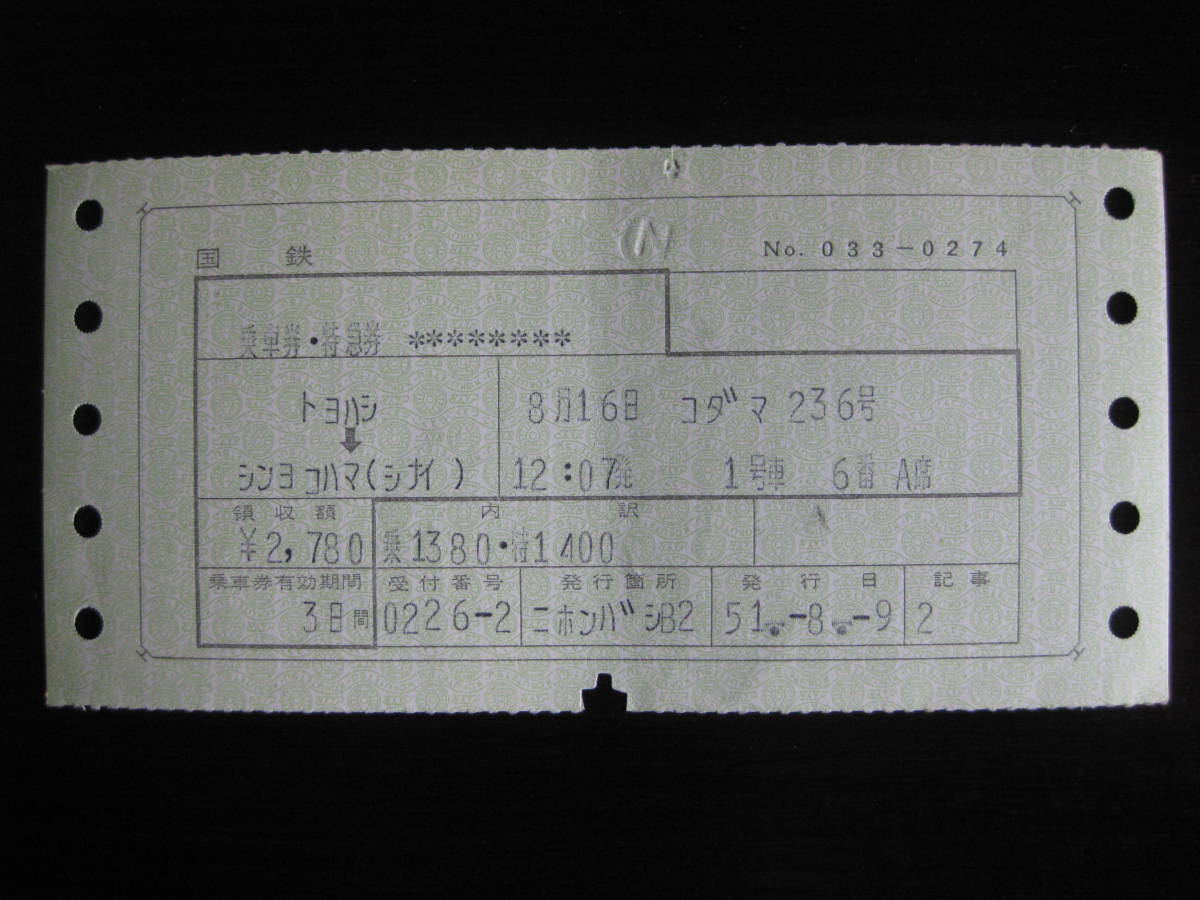 国鉄 マルス券 こだま236号 乗車券・特急券 豊橋→新横浜(市内) 初期N型