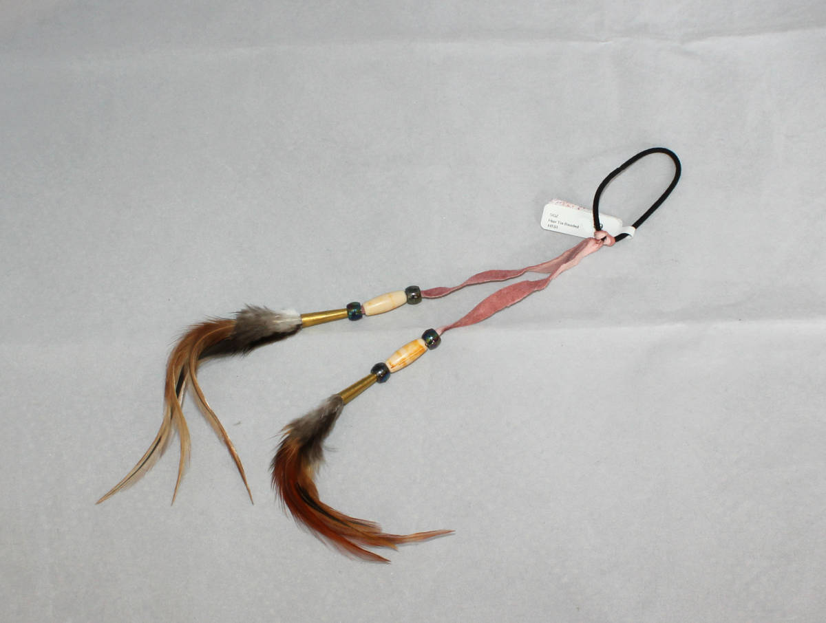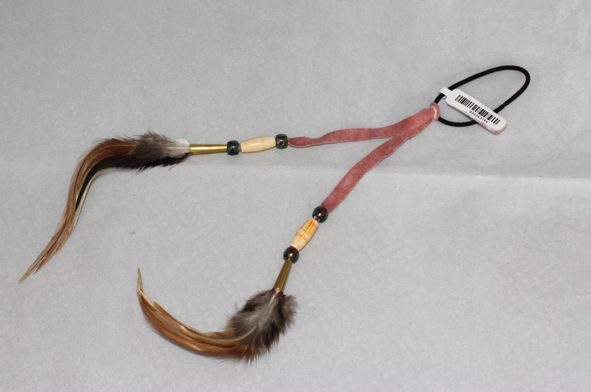 スエードレザーにビーズとフェザーのチャーム、ナチュラル素材でできたアメリカ インディアンスタイルのヘアゴム。