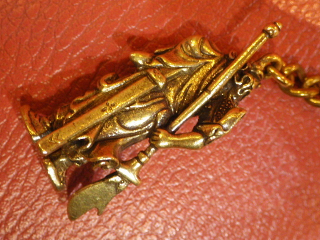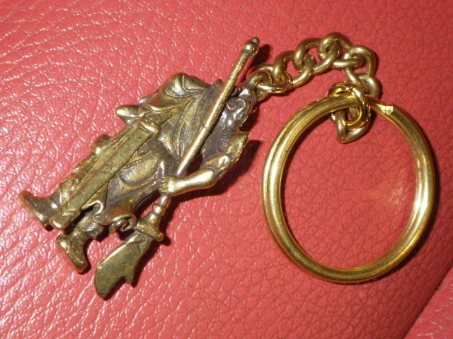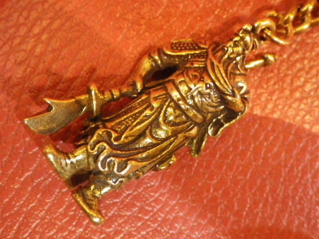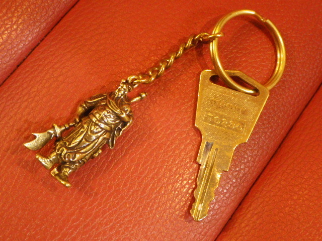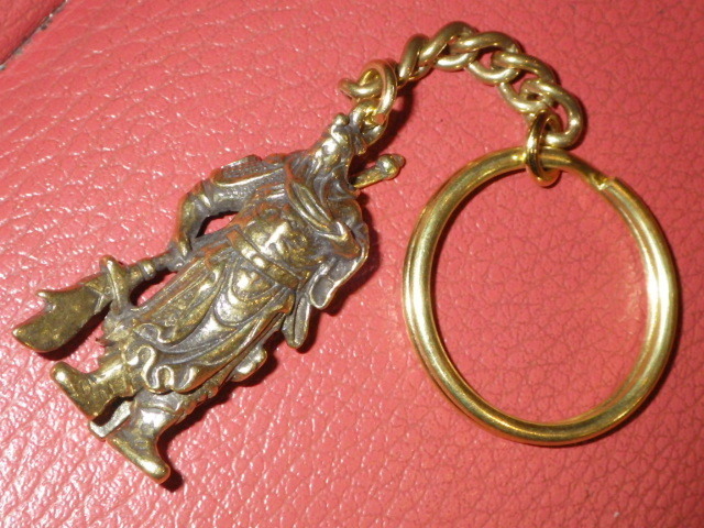 ブラス(真鍮)素材、サイズは関羽部分を計測して高さ4.2cm、チェーンとリングも含めた全長で10.3cmくらいです♪*画像の鍵は見本で付属いたしません。