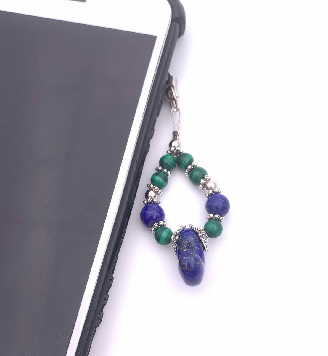 手作り!オリジナル★天然石ラピスラズリ勾玉&マラカイトのストラップ