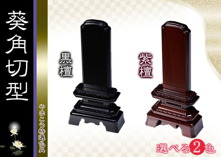 | 唐木位牌 葵角切型 黒檀調・紫檀調 3.5寸(色は下記プルダウンよりお選びください) 唐木位牌は伝統的、かつ高級感溢れる位牌です。また、極めて耐久性に優れ、長年にわたり御安置して頂けます。 お位牌の文字入れ加工が必要な場合は、ご購入時に当店へ【お客様ご要望】欄よりご記入の上お申し付けください。加工のご希望がない場合は未加工の製品をお届け致します。 文字加工は無料です。(御納品は、文字の仕様が決定後、2週間程お日にちを頂戴致します) 書体・字色は画像内見本の仕様のみとなります。また、弊社にてご登録の無い文字・二人書き等は別途、お見積りとなり有料となる場合がございますのでご了承下さいませ。その場合は商品注文キャンセルも可能となっております。 位牌加工内容は下記リンクよりフォーマットをダウンロードしてご記入ください。ご記入後、弊社までFAX、メール添付、郵送のいずれかにてご連絡下さい。 → お位牌文字フォーマット(クリック) 上記リンクのフォーマットがプリントアウトできない場合は、当店よりフォーマット用紙をFAXまたは郵送させて頂きます。ご注文時に【お客様ご要望】欄にFAX番号または郵便送付先ご住所をお伝えください。 | |||