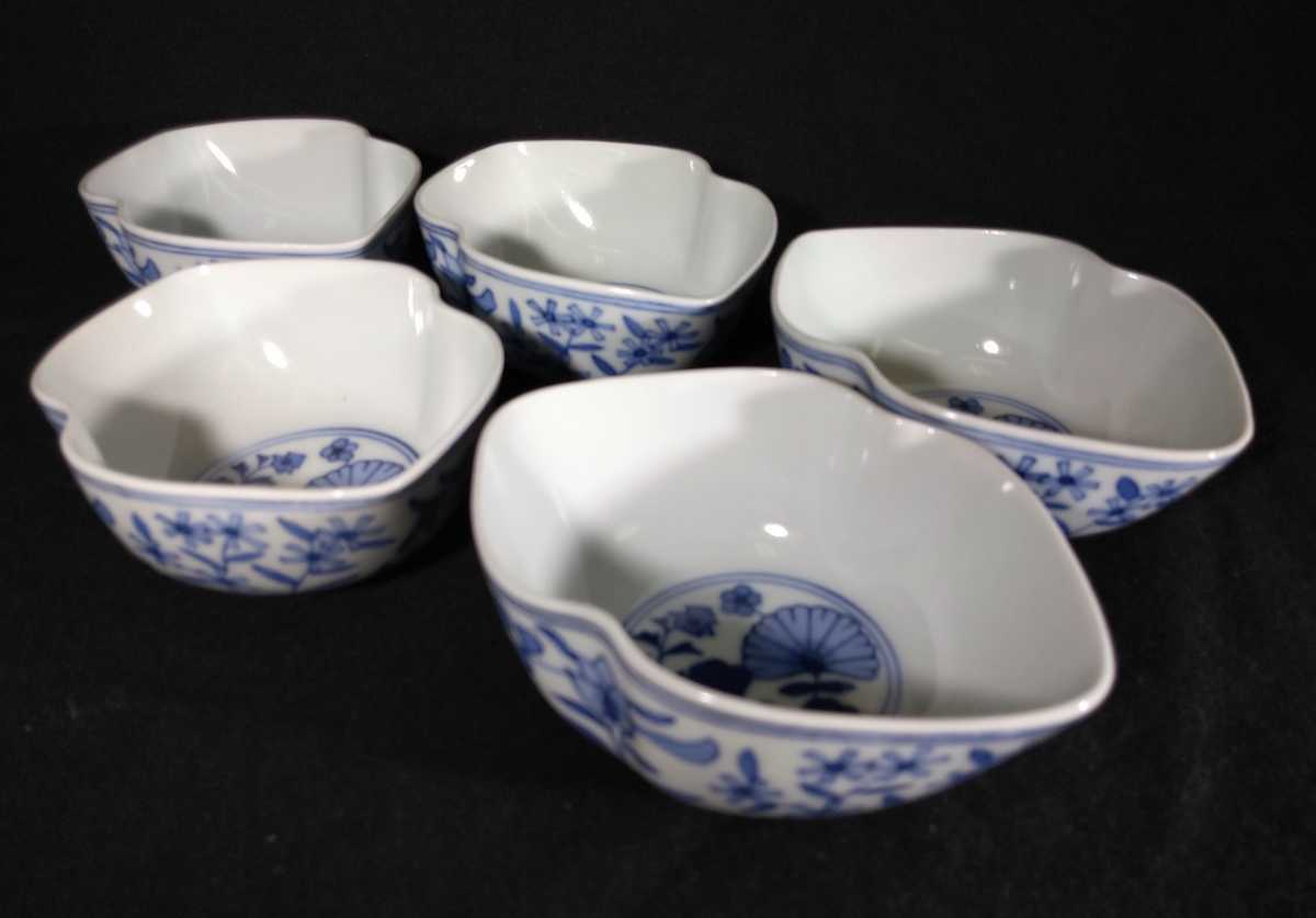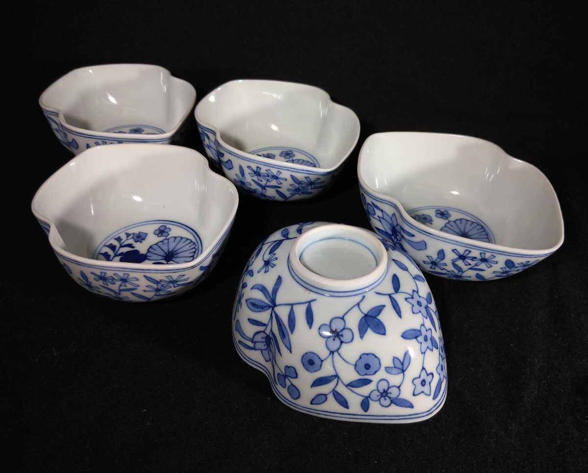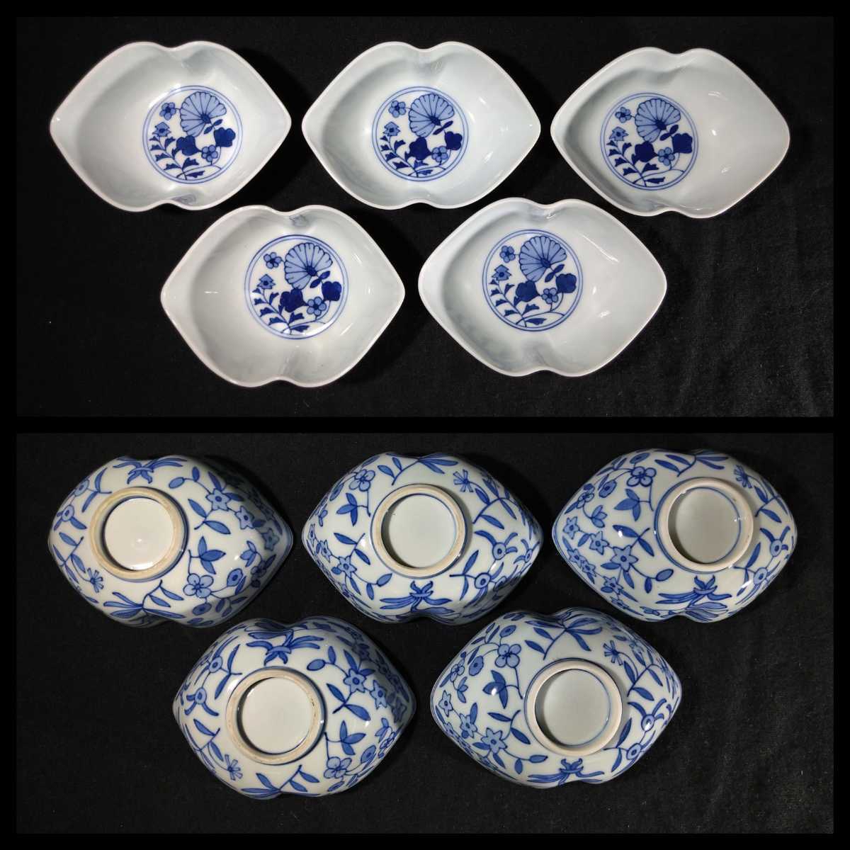 宮永理吉(1935-)先生造の華やかさと優しさを併せ持つ美しい変形向付5客組でございます。素人採寸で申し訳ございませんが、長さ14.0cm、9.8cm、高さ5.5cmでございます。