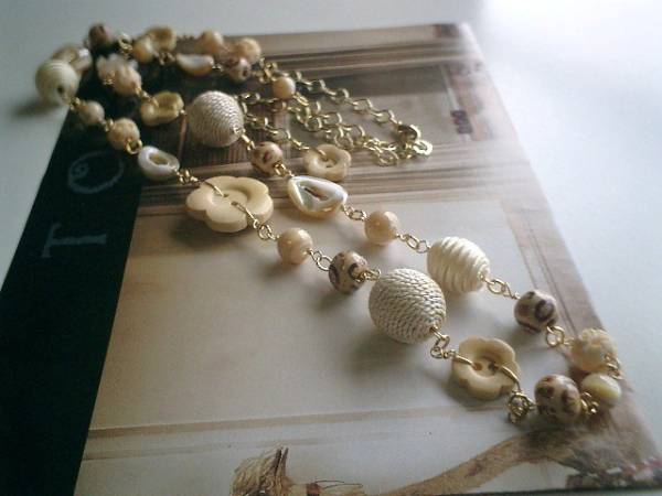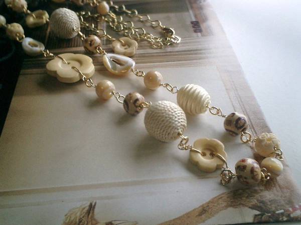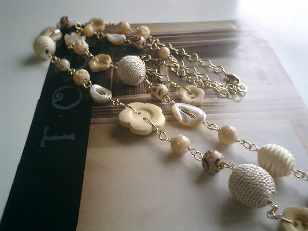 私的コレクション・・シリーズです♪木漏れ日の午後・・ナチュラルティストのネックレスです♪麻ボールやウッドやデザイン違いのマザーオブパールや彫りボーンなど大人色のベージュをデザインチェーンでまとめました♪小花模様のウッドは9ミリの丸玉、お花のウッドボタンは25ミリと15ミリ、ベージュ色のマザーオブパールは10ミリ、8ミリの丸玉、14×10ミリのオーバルや20×15ミリのオーバルや小鳥さん、彫りボーンは8ミリ位です♪麻ボールは18ミリ位、サテンボールは15ミリ位です♪長さは全長98センチ位で調節自由です♪2連にされても素敵です♪シンプルで長く着けられるデザインを考えて作りました♪お揃いのブレスレットやイヤリングも出品しています♪ハンドメイドをご理解頂いてノークレーム、ノーリターンでお願いします♪