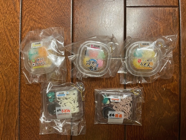 コンビニで販売されている冷やし麺をリアルなフィギュアにデフォルメしました。『コンビニ冷やし麺マスコット 全5種セット』になります。一個300円ガチャの割には精巧な仕上になっています。全て内袋未開封、リスト付きです。