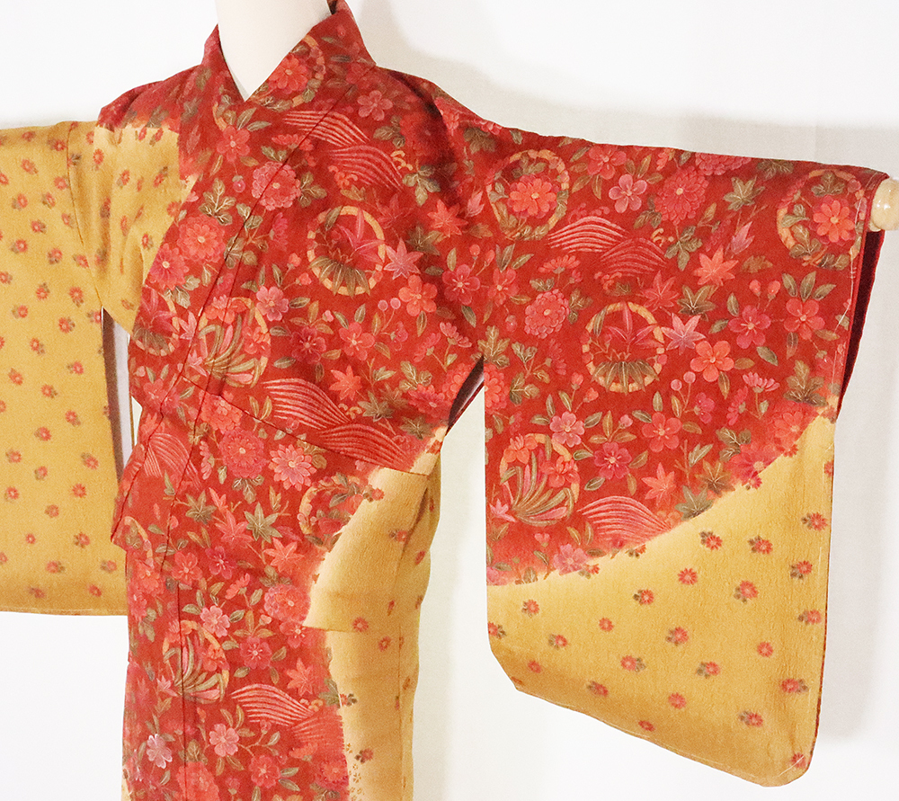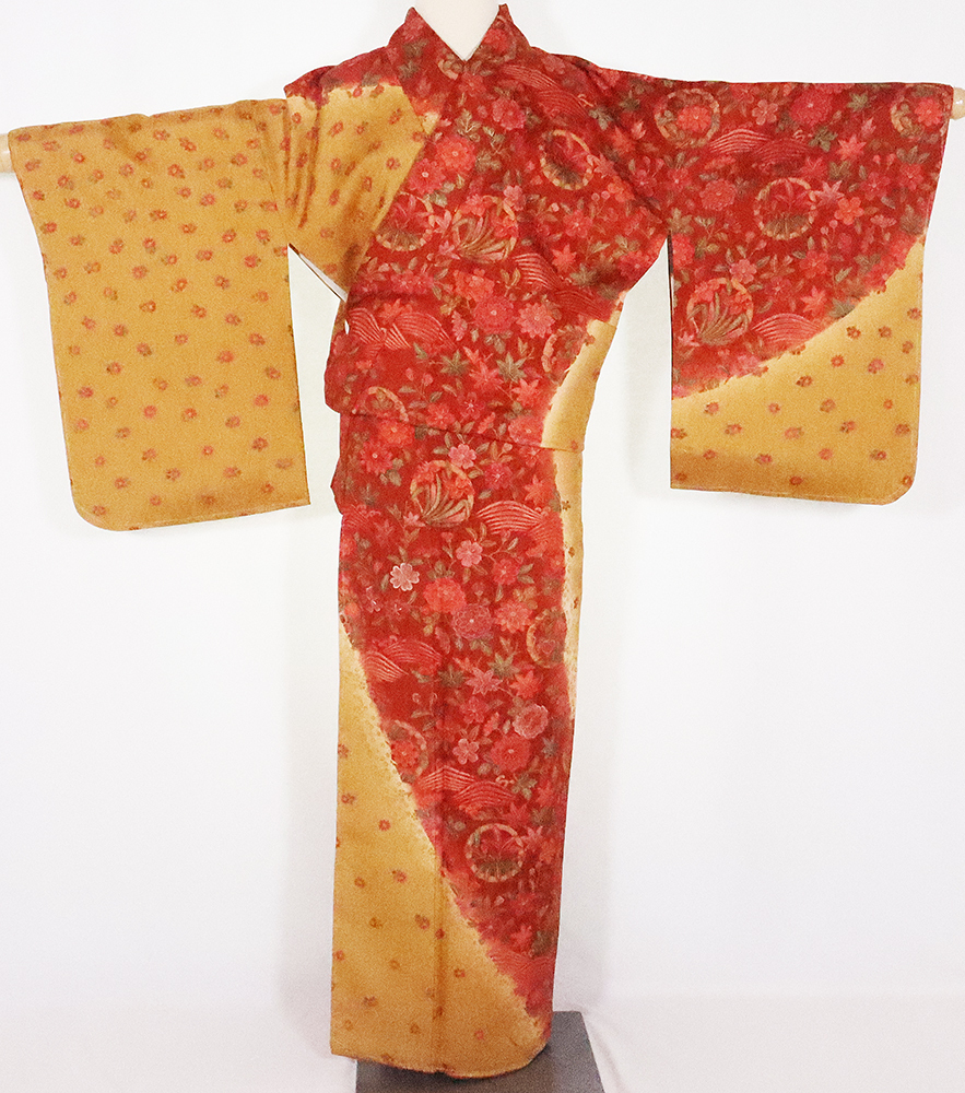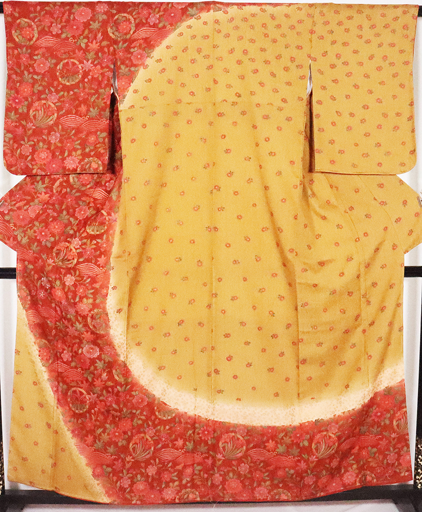 | 色・柄 | 訪問着 袷 丹後縮緬 ふくれ織地 黄緑・赤茶ぼかし地 花丸紋 菊・梅・笹・菖蒲・紅葉 (写真では上手く色が出ない場合があります。ご了承下さい) |