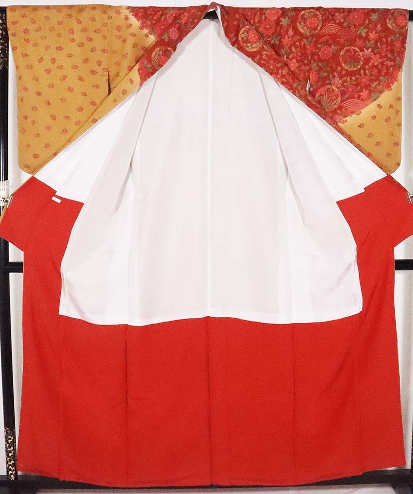 | 訪問着 袷 丹後縮緬 ふくれ織地 黄緑・赤茶ぼかし地 花丸紋 菊・梅・笹・菖蒲・紅葉 164 広襟 新品 仕付け付き | |