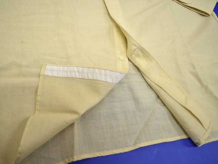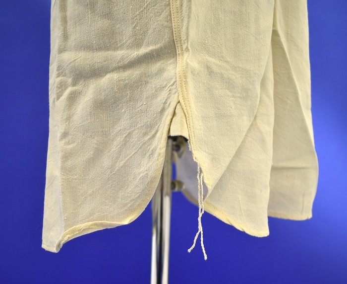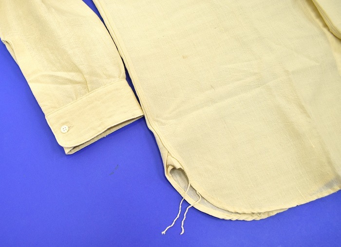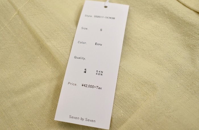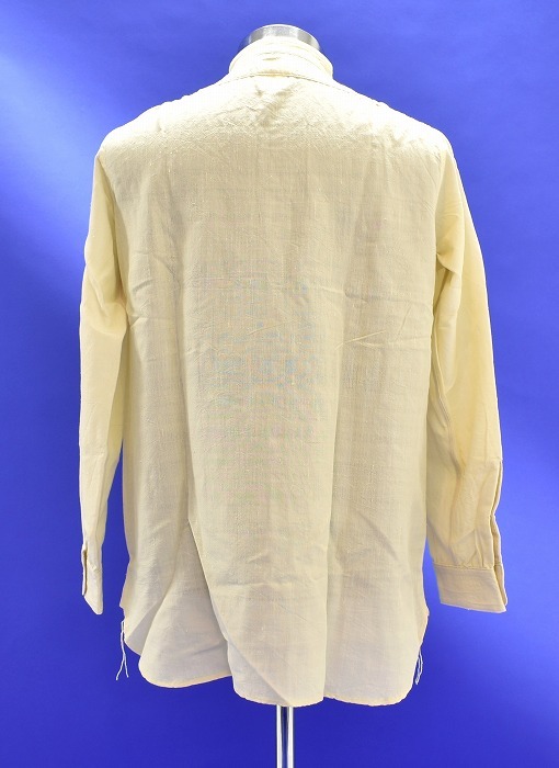 ・素材:ウール54%シルク46% ・カラー:ECRU(エクリュ/生成り) ・サイズ:S 実寸 肩幅 約41cm・身幅 約54.5cm・着丈後ろ 約78cm・袖丈 約60.5cm(多少の誤差はお許しください) 7×7とは、サンフランシスコの縮図(面積:49平方マイル)でローカルな人たちが使う愛称。 サンフランシスコを拠点にヴィンテージのバイイングをはじめ、 地元のアーティスト達と独自の交流を深めてきたディレクターの川上淳也氏が、自身が様々な影響を受けた地をテーマに、 自由な空気から生まれるファッションを提案しています。 「カディ」と呼ばれる手織りの特殊な生地を、古いワークシャツのディテールを備えたオリジナルのドレススタイルへと落とし込んだ。 「Khadi(カディ)」とはインド製の手紡ぎ手織り生地の総称で、糸を紡ぐ作業から始まって様々な専門職人に渡り、全ての工程が手作業で行われて初めて完成される非常に手間のかかる生地。 手作業であるからこその独特な織りムラや風合い、不均一なネップ感による秀逸な表情は他には無い魅力に溢れているとともに、そのムラや透け感が優れた通気性を宿し、心地良いドライタッチな質感とともに速乾性もあって、機能面でも非常に優れている。 こちらで採用した素材はシルクとウールを絶妙な混率で構成した手織り生地で、「Khadi(カディ)」が本来持つ魅力に加えて、シルクの高級な表情と肌触り、ウールの重厚感と吸湿性が加わった、より一層特別な風合いとなっています。 衿羽を取り払い台衿のみを残したバンドカラー、そして少し湾曲したショートポイントのカラー。 5角形のパッチポケット、一つボタンの「イッテコイ」始末のカフス。 サイドを巻き縫いで仕立てた身頃の裾はマチ付きで尚且つ 絡めた糸を外に流す「空環止め」で仕上げているなど、装飾としてではなく機能性を重視した古いワークシャツの堅牢な仕様で構成することで、特殊なKhadi(カディ)の秀逸な表情も優れた機能も存分に活かされた。 裾側のフロントボタンのみ比翼にするといった、実にさりげないながらも他とは一線を画す特殊な仕掛けも。 ステッチの間隔が狭い非常に丁寧で細かい縫製で、ドレスシャツのパターンメイキングを駆使して洗練されたシルエットに、ボタンにしてもシェルボタンを使用するなどして高級な雰囲気を宿しながら現代でリアルに機能する一着へと仕上がっています。 オールハンドメイドだからこその風合いを宿す素材。 今では失われつつある古き良き時代の堅牢な縫製と仕立て。 現代の大量生産の中では決して宿らない魅力を宿して尚且つ、7×7(セブンバイセブン)独自の解釈が加えられて、今にも昔にも無い特殊な存在感を漂わせる、唯一無二の大人のドレススタイルに。 新品 日本製 ¥46200(税込) ※毛玉感や甘撚りでの糸ムラ、浮き等がありますが、手作業による もともとの風合いです。 かなりお値打ちだと思います。この機会にぜひ!。 他にもいろいろ出品しています。 管理番号:282110MY-087816 ★ PD162405-1000 |
