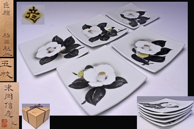 末岡信彦 ★ 色絵椿図組皿5枚 ★ 共箱共布 ★ 検 人間国宝 藤本能道 釉下彩 ★ 絵画のような食器