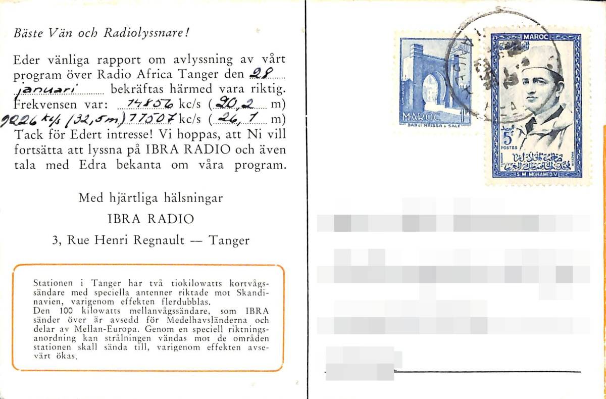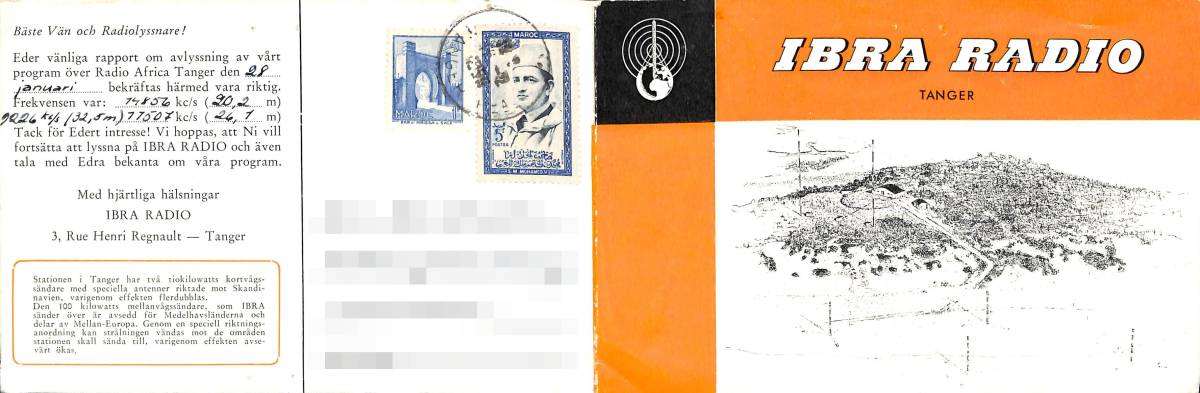 【商品名】・・・IBRA RADIO TANGER(★イブラ・ラジオ・タンジール)の★二ツ折ベリカード。 ■当方、1枚のみ所有していますので即決で落札者様のコレクションになります! ■【コメント】・・・1977年発売のベリカードコレクションに幻のベリカードとして紹介されています! ■1959年末廃局。 ■国際都市タンジールにあったイブラ・ラジオは、日本語放送も行っていました。 ■タンジールがモロッコ政府に撤収されるまでアフリカの北端で放送していました。 ■世界でも数十枚あるかどうかと思います? ★まさに幻のベリカードです! 【国名・地名】・・・モロッコ王国★タンジール。 【受信データ】・・・1959年1月28日★SW14856KHZを受信。 【記載事項】・・・受信データ・受信者の住所・氏名が記載。 【状態】・・・シワ、汚れ、シミ、焼け、ピン穴、色あせ等があります。 ■カードの状態は★画像を参考に判断して下さい。 ■この機会にぜひこのベリカードを貴方のBCLコレクションに加えて下さい! | |