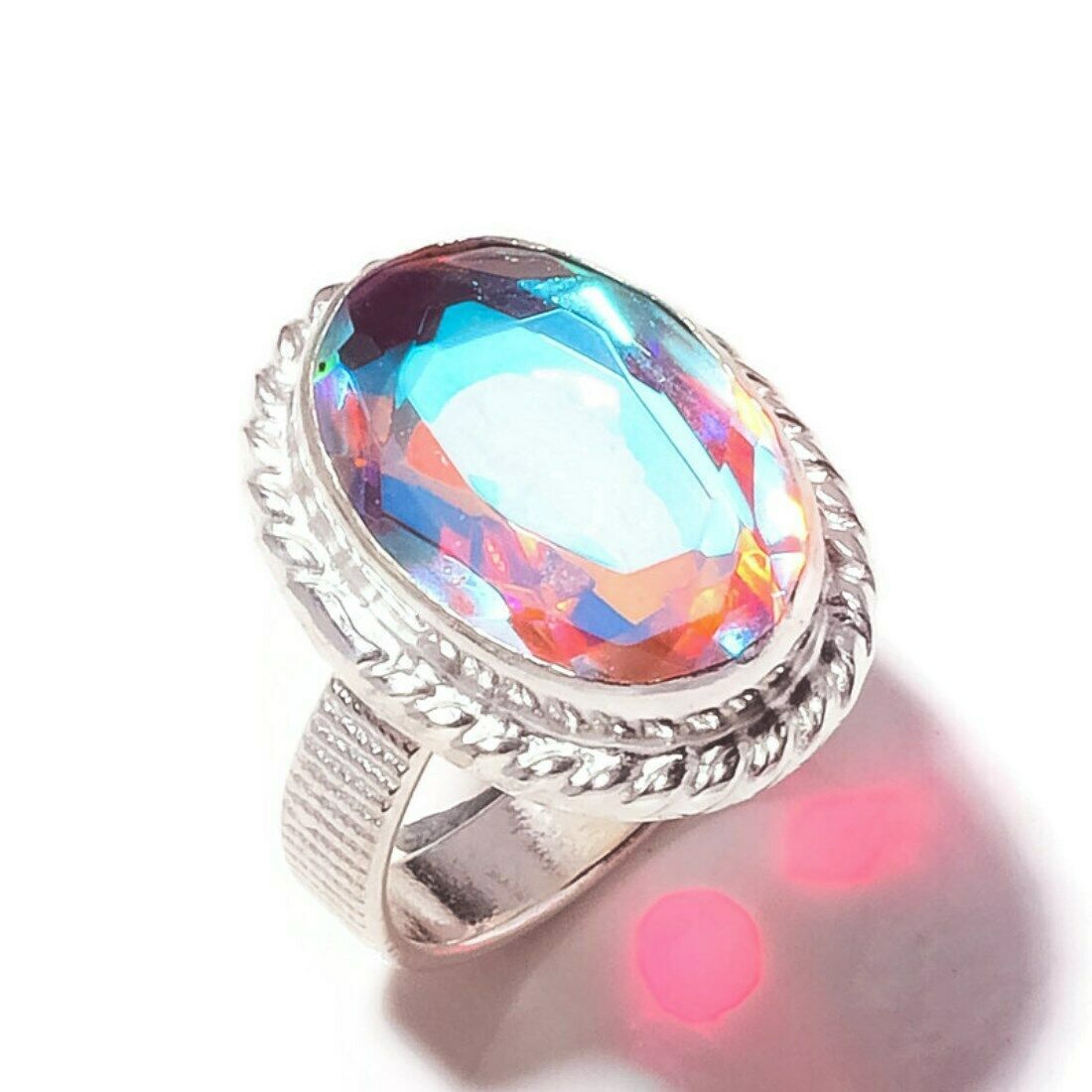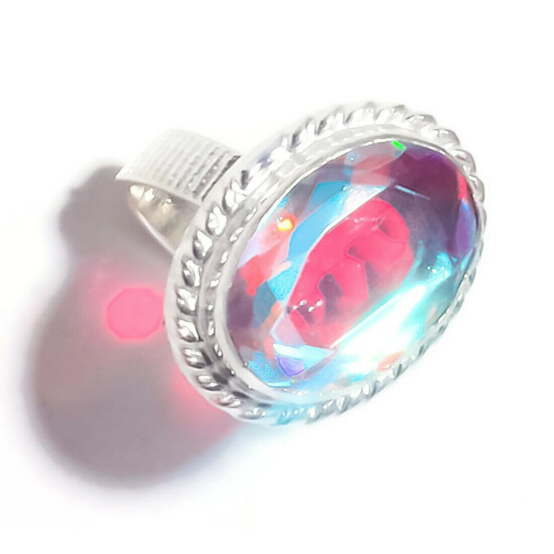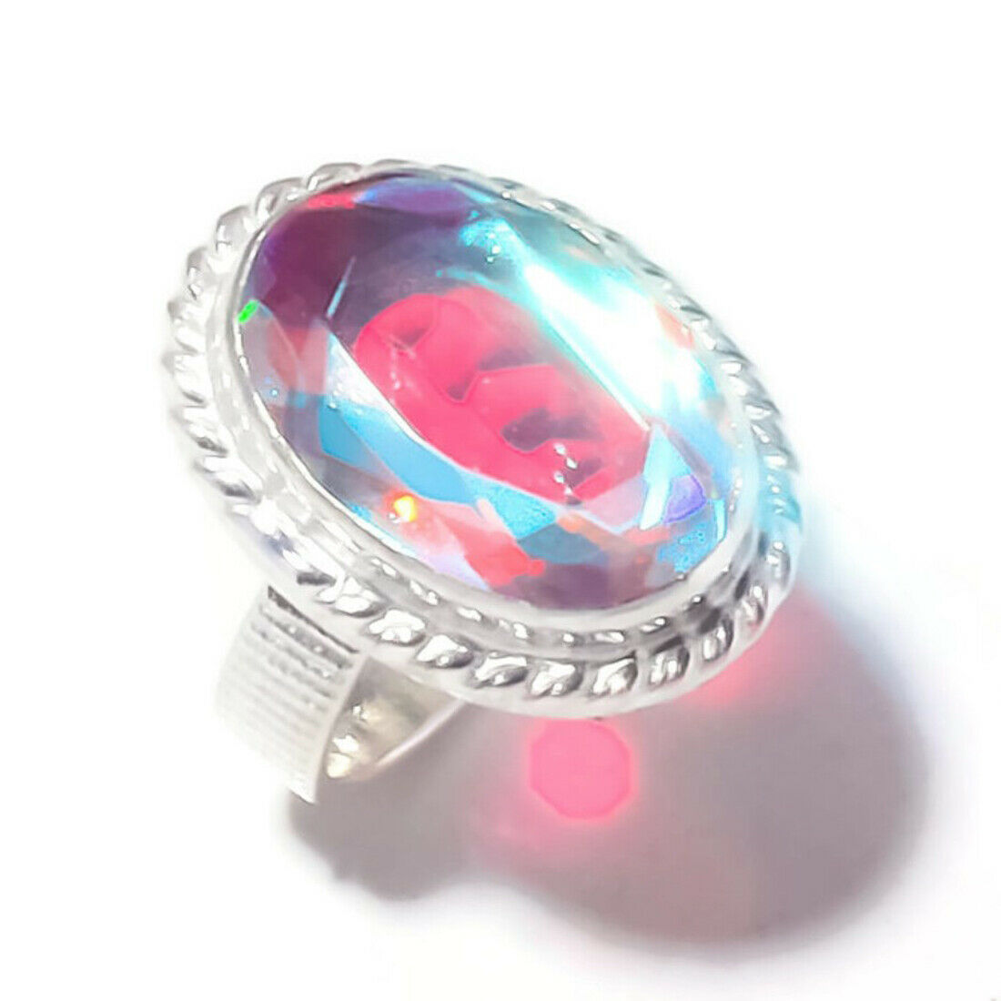 輝くレインボーファイアートパーズオーバルジェムストーンシルバーオーバーレイハンドメイドリングUS-6.5