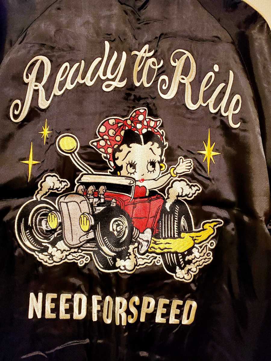 ベティーちゃんがクラシカルなホットロッドで駆け抜けるシーンを刺繍した、スカルワークスとベティー・ブープのコラボスカジャン!
