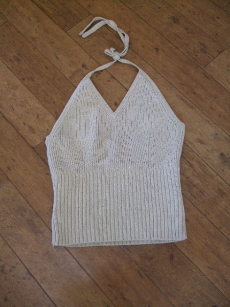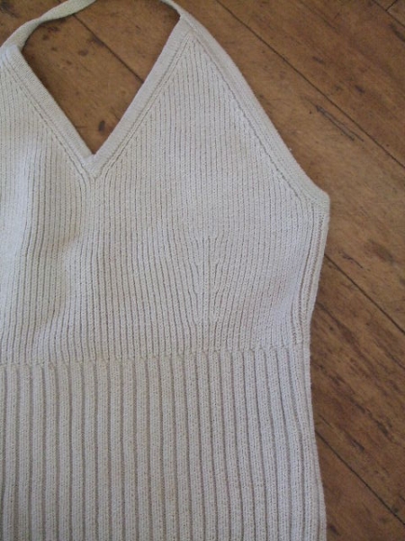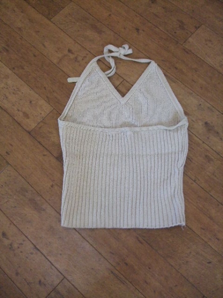 商品紹介 | ホルターネック型のキャミソールです。 コットンニット素材で、上と下で編み目の大きさが異なっています。 色はベージュです。 《素材》 コットン100% |