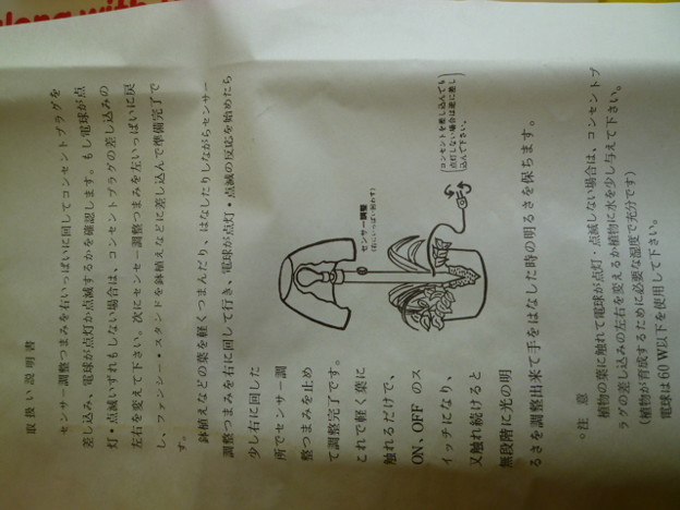商品は「 ◆入手困難 鉢植え用照明 園芸 植物 観葉植物 ガーデニング◆ 」となります。 昔の珍しい鉢植え用照明です。 今では売っていない物で、あまり流出しない入手困難な物です。 コードに1983とございますので80年代の物です。 デットストック品で照明部の動作(タッチセンサー/点灯確認/センサー感度)のみ確認しただけです。 デットストックと偽って動作不良品を送りつけるような事はございませんのでご安心下さい。 動画で動作状況/使用方法など掲載しましたので、届きましたら画像や動画を見て自慢の鉢植えに設置してください。 ユーチューブ 動作確認状況 なお電球なので、枯れた植物には火災の恐れもございますので設置しないで下さい。 センサー部が現代のLED電球に対応しているかは手持ちにLED電球が無いので分かりません。 電球は40Wとなります。 サイズですが、棒の茶色い部分(木目のみ)で38cmです。 電球や差込口も含めると約60cmとなります。 差込み口からコードまでは約23cmなので20cm位は差し込んでも良いかと思います。 シェード部分は折り畳みで、未開封です。 白と黒のコントラストでレトロな雰囲気がでるかと思います。 外袋から見た感じでは染み汚れらしきは見当たりませんが、洗濯もできるようなのでさほど問題では無いと思います。 他は説明書自体を画像に掲載しますのでご確認下さい。 結構大きめの鉢植え用かと思います。 自慢の観葉植物等の鉢植えにいかがでしょうか? |