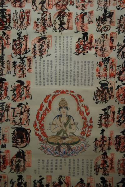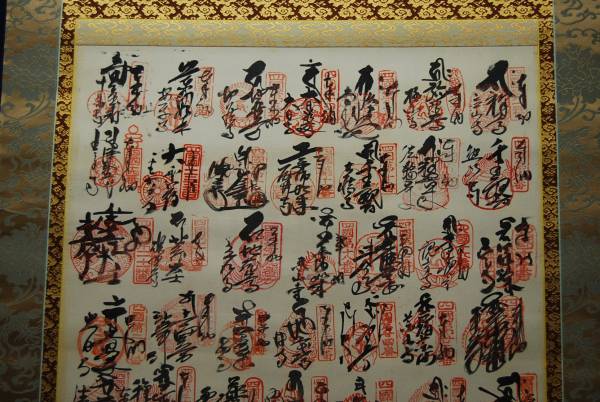 【参考】四国八十八箇所(しこくはちじゅうはっかしょ、「四国八十八ヶ所」とも表記される)は、四国にある空海(弘法大師)ゆかりの88か所の寺院の総称で、四国霊場のもっとも代表的な札所である。単に八十八箇所とも言い、あるいはお四国さん、あるいは本四国とも言われている。四国八十八箇所を巡拝することを四国八十八ヶ所霊場会では四国巡礼と言い、似たような呼び方として四国遍路、四国巡拝などともいう。なお、2015年(平成27年)4月24日、文化庁は日本遺産の最初の18件の一つとして「四国遍路ー回遊型巡礼路と独自の巡礼文化」を選んだと発表した。 四国八十八ヶ所霊場集印肉筆 八十八箇所 【作品状態】 本紙、表装共に概ね良好ですが、巻裏に多数の虫ナメあります。 紙箱付 軸丈 縦 200㎝×幅 75㎝ 写真で状態をご判断の上、宜しくお願い致します。