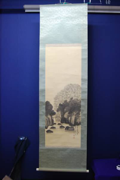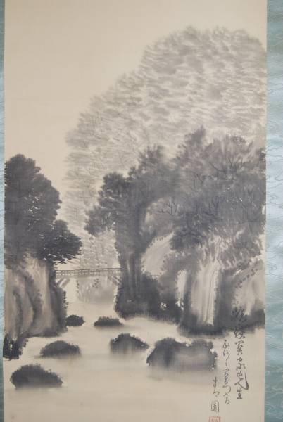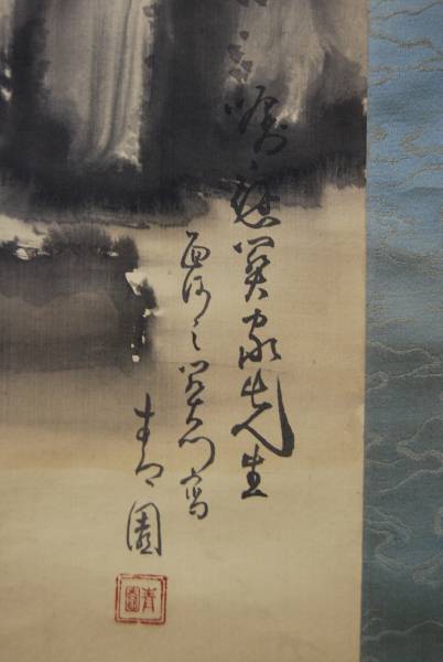 【参考】青園 山水図 為書き 【作品状態】 本紙は絹本肉筆です。 本紙は多少の薄汚れ・巻シワがあります。 表装は多少の時代感あります。   紙箱付 軸丈 縦 190㎝×幅 60㎝ 写真で状態をご判断の上、宜しくお願い致します。