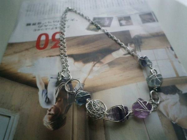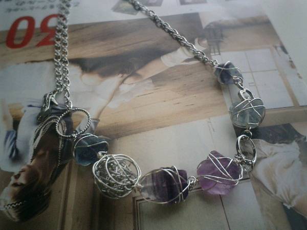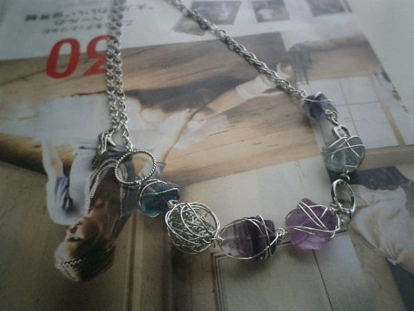 愛しいお気に入り・・シリーズです♪儚げな色を集めて・・繊細なフローライトの原石を集めたネックレスです♪やさしい神秘的なお色が儚げにロマンチックしています♪ワイヤーでおめかししたパープルやダークブルーやモーヴピンクのフローライトは13ミリから16ミリ位のラフ・ロックです♪ジルコニアリングやハートのチャームやワイヤーボールを合わせて可憐な表情です♪長さは全長66センチ位で調節自由です♪チョーカー風にされても素敵です♪♪お揃いのブレスレットも出品しています♪シンプルで合わせやすいデザインを考えて作りました♪ハンドメイドをご理解いただいてノーリターン、ノークレームでお願いします♪