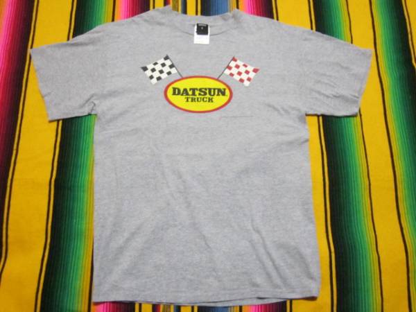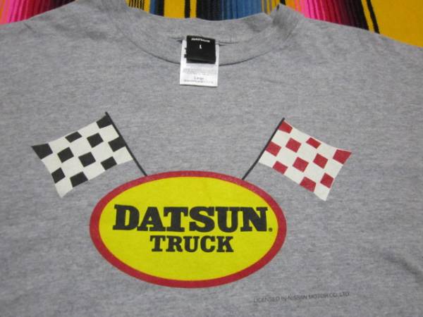 フロントのマルチカラーの DATSUN TRUCK クラシックロゴ、クロスチェッカーフラッグ グラフィックデザインの入り方がアメリカンモータースポーツアイテムらしく、半端ではなく良い感じ