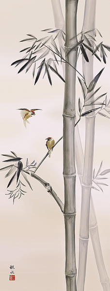 挙げられる竹に、仲睦まじい夫婦雀を描いた