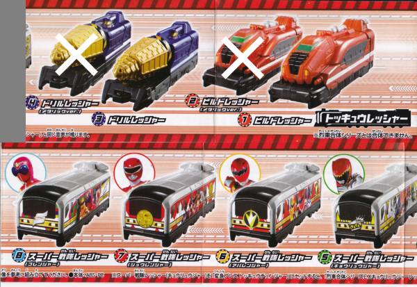 ■内訳:ビルドレッシャー、、ドリルレッシャー、、スーパー戦隊レッシャー(キョウリュウジャー)、スーパー戦隊レッシャー(アバレンジャー)、スーパー戦隊レッシャー(ジュウレンジャー)、スーパー戦隊レッシャー(ゴレンジャー)の全6種です