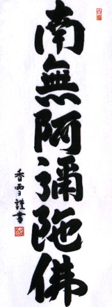 | 作品説明: | 阿弥陀如来の御心が鮮やかに胸に迫りくる名品。 真宗では如来の変わりとされる価値あるご名号を渾身の筆で 一気に書きあらわした仏事掛の名品です。 仏事用の表装をしております。 六字名号とは 南無阿弥陀仏 「南無」とは、帰依するを意味し、「阿弥陀仏に帰依する」の意味があります。 『観無量寿経』の「下品下生」に、 かくのごとく心を至して、声をして絶えざらしめて、十念を具足して南無阿弥陀仏と称せしむ。 仏名を称するがゆえに、念念の中において八十億劫の生死の罪を除く。 とある。この六字は、すなわち法蔵菩薩(阿弥陀仏の修行〈因位〉時の名)が修行し、 大願大行を成就して正覚を得た上の名であるから、「果号」とも呼ばれ。 如来のはたらきのすべて顕すとして、名号の中でも最も尊重され、本尊として用いられております。 このことから蓮如の言行録である『蓮如上人御一代記聞書』に、 一のたまはく、「南無」の字は聖人(親鸞)の御流義にかぎりてあそばしけり。 「南無阿弥陀仏」を泥にて写させられて、御座敷に掛けさせられて仰せられけるは、 不可思議光仏、無礙光仏もこの南無阿弥陀仏をほめたまふ徳号なり。 しかれば南無阿弥陀仏を本とすべしと仰せられ候ふなり。 と述べたことが伝えられ、阿弥陀仏の働きのすべてを顕すとされております。 |