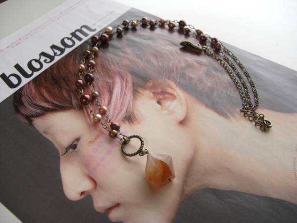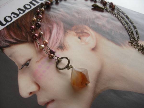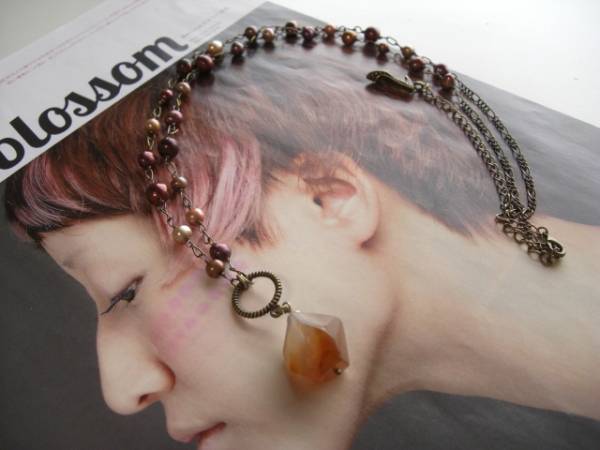 モードな秋色・・シリーズです♪ニュアンス・パール・・シックなブラウン系の淡水パールのネックレスです♪トップにデザインリングやラフカットの瑪瑙を合わせてアンティーク・モダンしています♪淡水パールは6ミリから8ミリ位までのブラウンやダークレッド、シャンパンゴールドです♪トップの瑪瑙は20ミリ位です♪長さは全長90センチ位で調節自由です♪お揃いのブレスレットも出品しています♪シンプルで飽きのこないいつまでも着けられるデザインを考えて作りました!ハンドメイドをご理解頂いてノークレーム、ノーリターンでお願いします