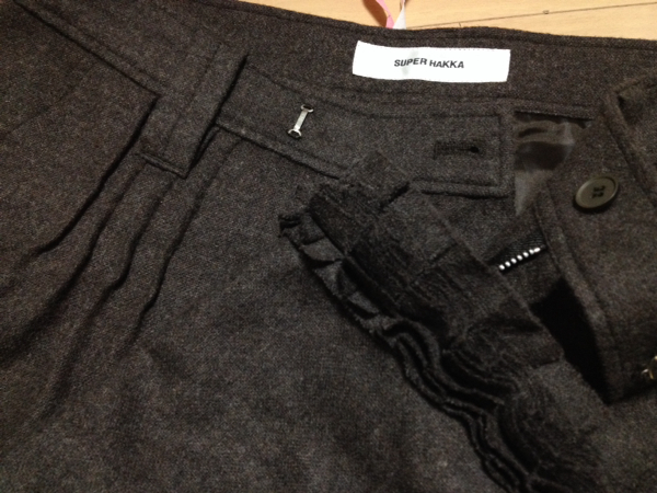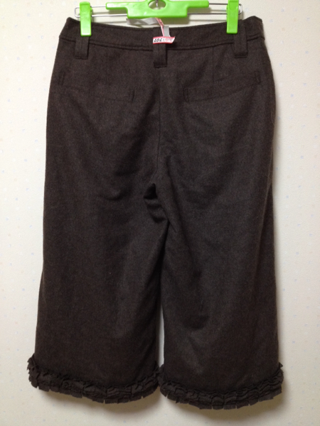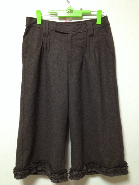 ブラウンの丈短めパンツで、裾がおしゃれですね。