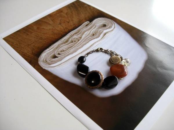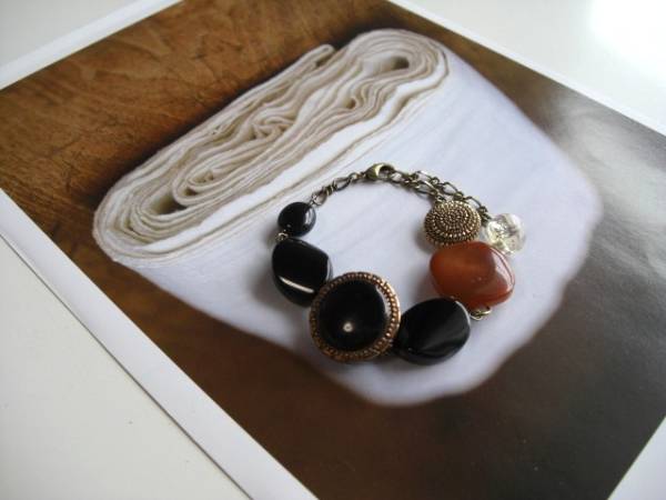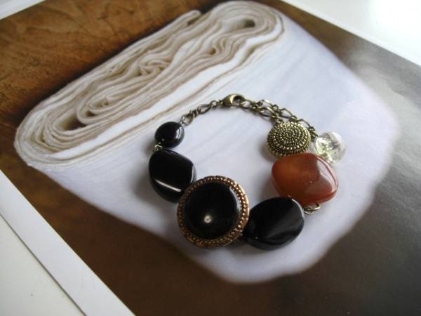 オーバルやオーバルツイストのオニキスにアンティークボタンを合わせてキュートな表情です♪オニキスは12ミリから20ミリ位までです♪ブレスレットの長さは全長23センチ位で調節自由です♪お揃いのネックレスも出品しています♪ハンドメイドをご理解いただいてノークレーム・ノーリターンでお願いします♪