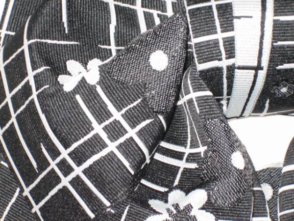 女性浴衣用、地紋柄結び帯  くろ ポリエステル  新品(織り地紋柄ありです。波状の写りはレンズの光学的ないたずらで現品にはありません、また薄く濃く写っている場合もあります)、胴部--帯巾約17,0cmx長さ約130cm、リボン部は横に約30cm。見た範囲で汚れないと思いますので、着用には問題ないと思います、。なお処分特価で出品です。